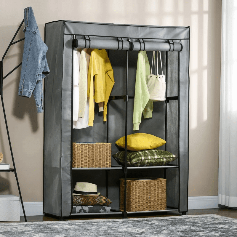 Temporary wardrobe design: Formed of a metal frame and a fabric cover, this portable closet wardrobe can be set up and taken down easily. Move it around and use wherever you need, anytime.