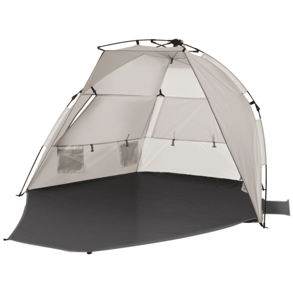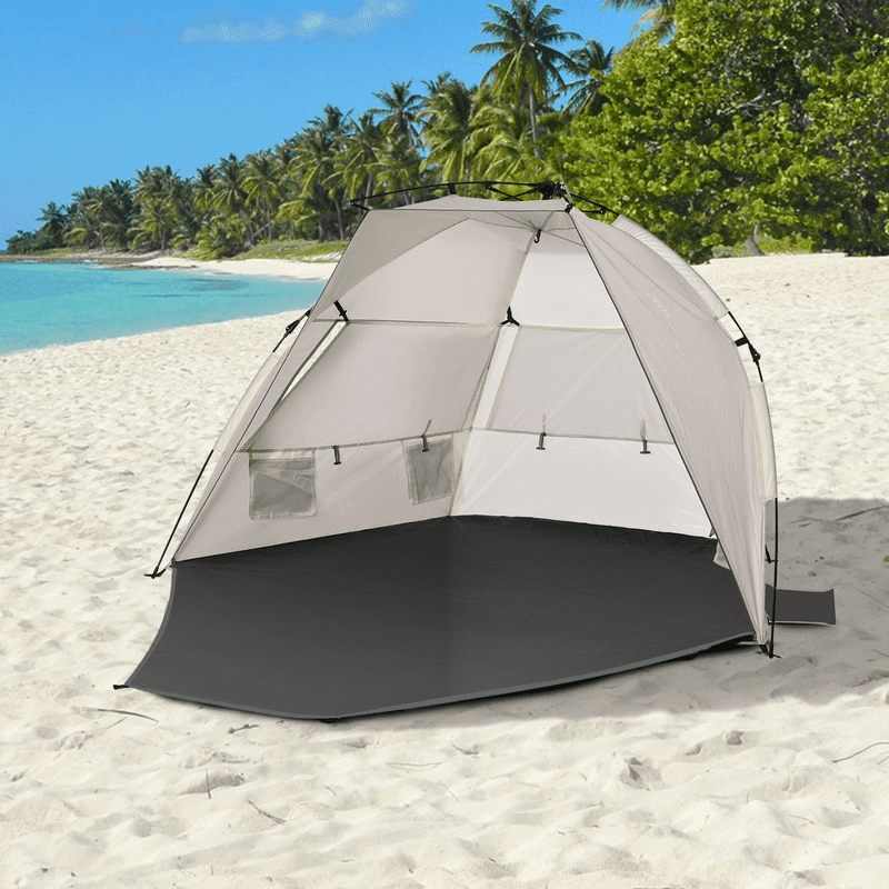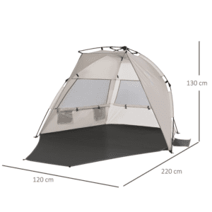POP-UP DESIGN: Easy to set up and take down, giving you a beach shelter within minutes. Fibreglass structure to stand upright all day long. TWO MAN SIZE: Plenty of room for you and a friend to relax, giving you space to keep all your belongings inside the pop up sun tent too. THREE MESH WINDOWS: Allows fresh air inside the sun tent to keep you cool at the back. Large open entrance so you can enjoy the beach openly. LONG FLOOR: Holds your belongings without touching the sand. THREE DRAWSTRING BAGS: Fill with sand to add extra weight to the uv tent. Can also be used as extra storage. Ground stakes also included. DIMENSIONS: 130H x 220L x 125Wcm. Folded: 12H x 106L x 66Wcm.