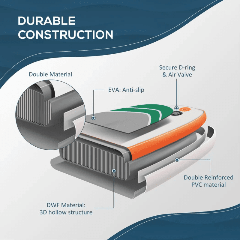 PADDLE BOARD KIT: Comes with an adjustable aluminium paddle for different heights, an air pump to keep the board properly inflated, a backpack to carry the board, three fins for smooth paddling and a repair kit.