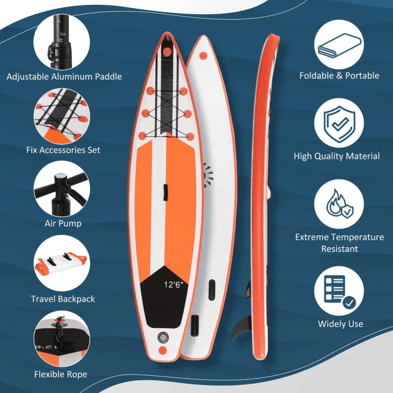 PADDLE BOARD KIT: Comes with an adjustable aluminium paddle, air pump, backpack, three back fins and a repair kit.