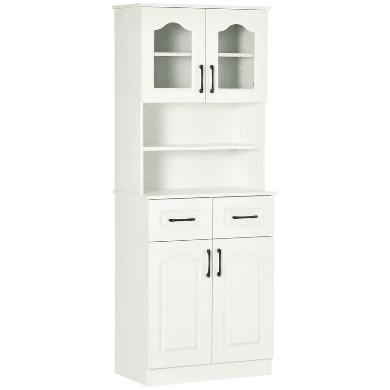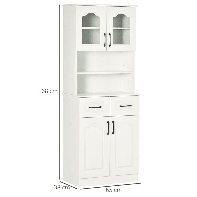 Multi-storage: Kitchen storage cabinet features a top and bottom cupboard, two middle shelves and two drawers – room for kitchen and dining essentials. Two flexible shelves: Move up/down easily in this storage cupboard – or simply remove them. Changes this storage space instantly. Contemporary: White colour, with black handles and glass doors. Simple and beautiful, this kitchen storage unit is suitable for many home interiors. Anti-tipping straps included: Attach this pantry cupboard to a wall so it won’t fall over. Safe for family homes. Dimensions: 168H x 65L x 38Wcm. Maximum load 80kg. Assembly required.