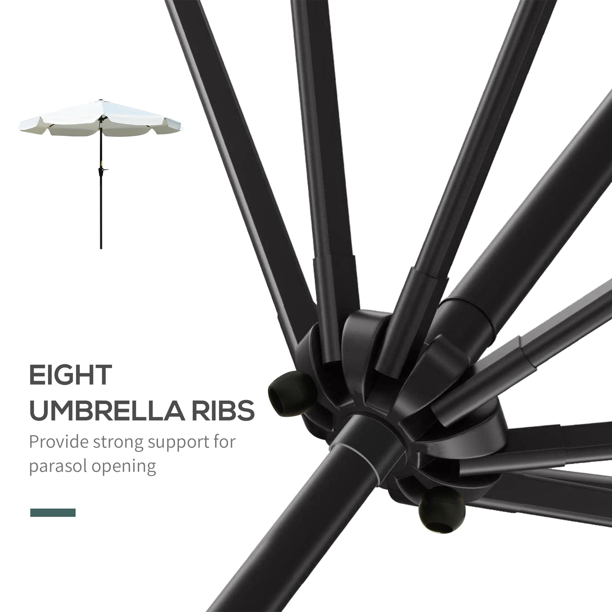 Powder coated aluminium pole for a strong structure, with eight canopy ribs for extra support