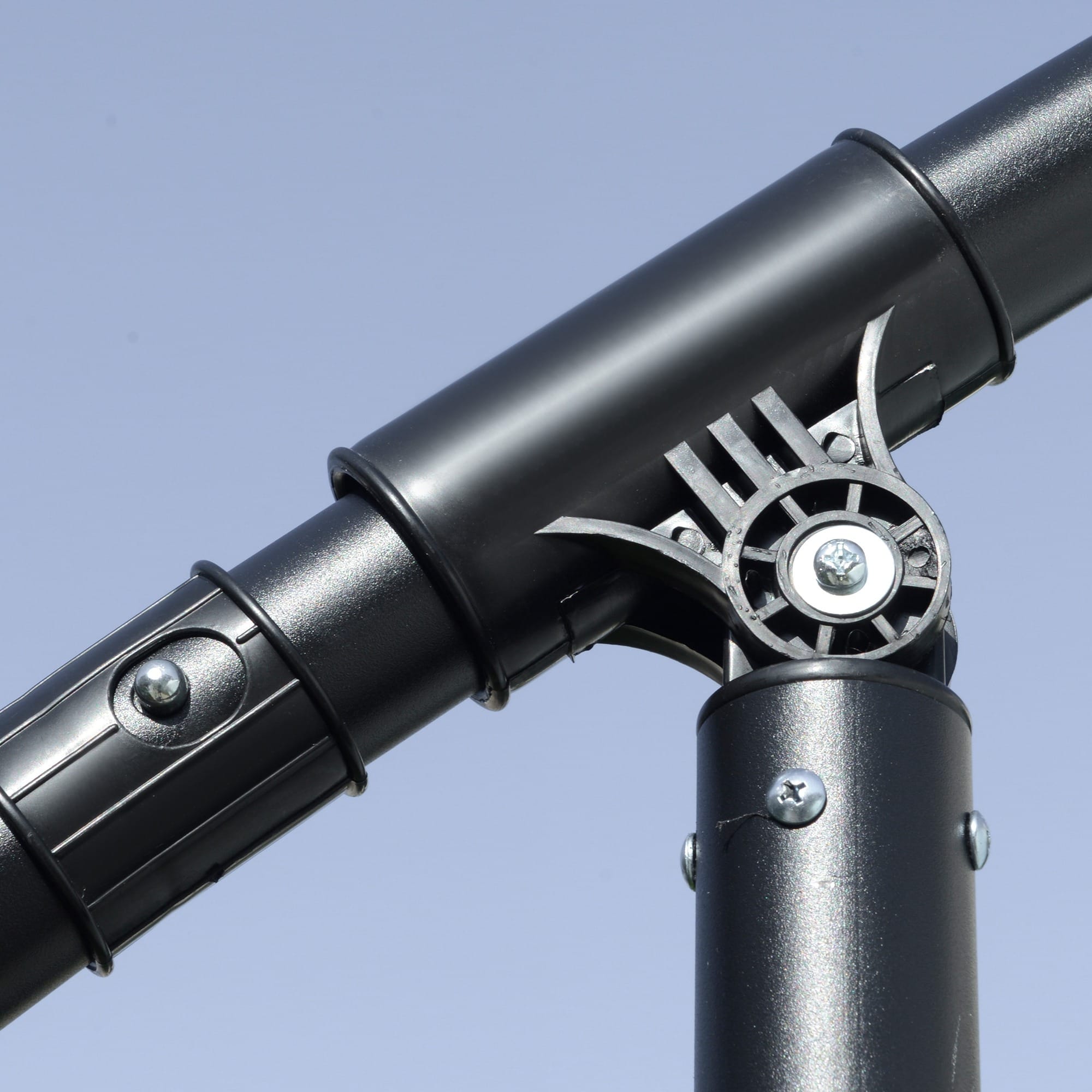 Metal pole for a tough structure, connected to the canopy via eight ribs for extra support