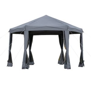 Our Outsunny pop-up tent is great for outdoor parties, gatherings, camping trips. Made from breathable polyester fabric to protect you from direct sunlight. Its large sizing provides enough shelter for yourself and several other people, with an all-steel frame for reliability. Removable mesh sidewalls for protection from mosquitoes. Comes with guy ropes and ground stakes to set it into place comfortably, it can all be folded and stored in a bag.