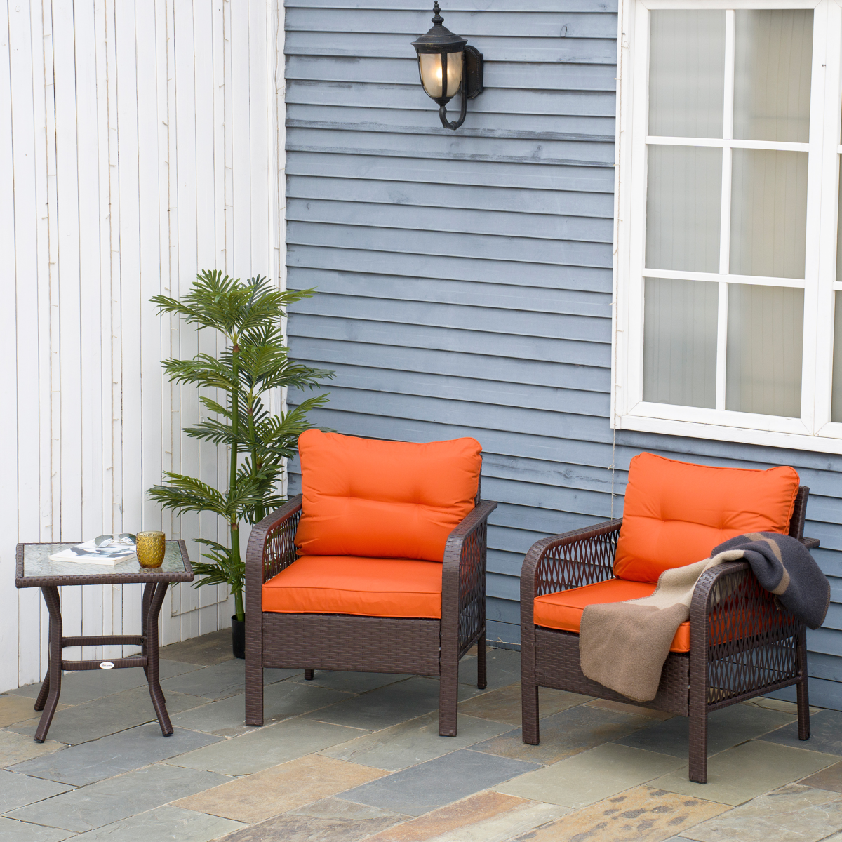 Three-piece set: Comes with two chairs with arms and a matching table. Both seats come with thick padded cushions for comfort. Tempered glass tabletop: A safe and solid holding place for everything you need. A sleek touch to the over look. Metal frame, wrapped in wicker: An on-trend garden design. Strong and supportive core, with protective plastic wrapped on top. Padded cushions: Keep comfortable as you relax in this set. Dimensions: Chair: 75H x 65W x 66Dcm. Table: 50H x 50W x 50Dcm. Assembly required.