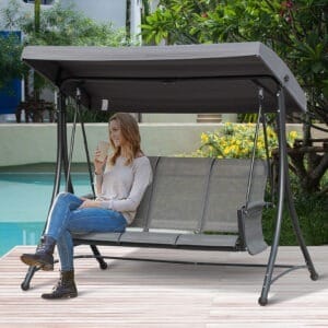 ADJUSTABLE CANOPY: Easy to change the angle of this 3 seater swing seat’s canopy, creating shade and protection from direct sunlight and light rain.