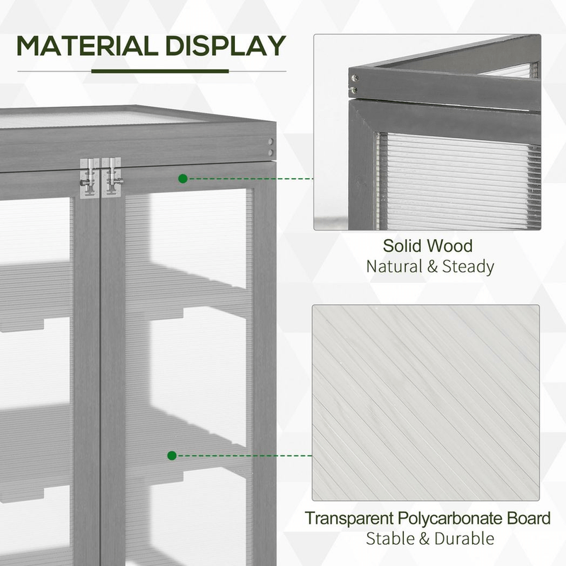 The small wooden greenhouse is made from fir wood and polycarbonate panels, with a top access opening and double doors for its forwarding opening. This wooden mini greenhouse will extend growing season and protect young plants from frost