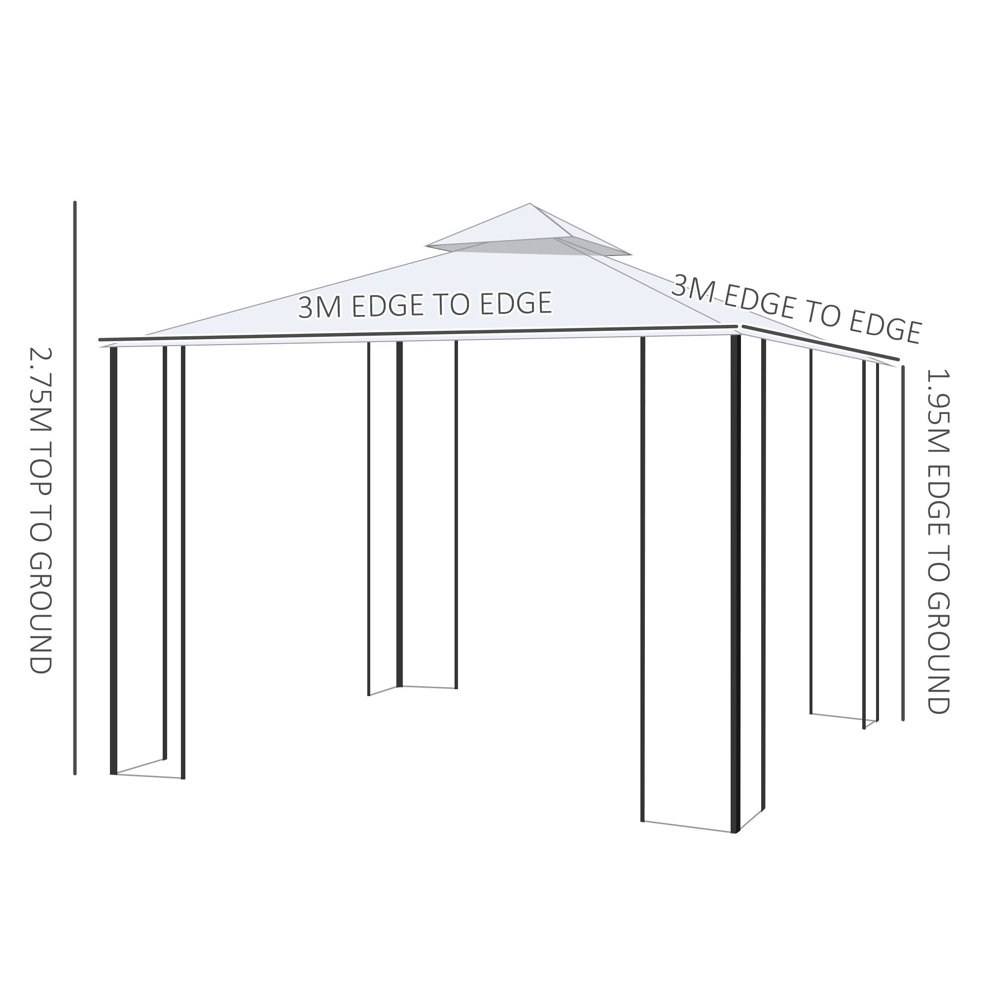 – DIMENSIONS: 2.75H x 3L x 3Wm. Eaves: 1.95Hm.