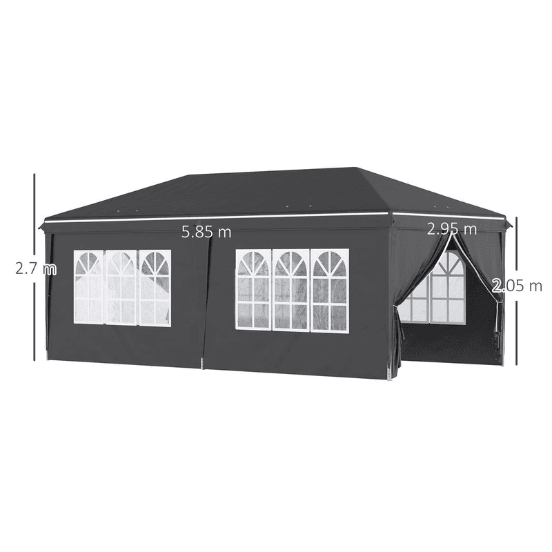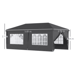 Dimensions: 5.85L x 2.95Wm, Top Height: 2.7 m, Eave Height: 2.05 m. Quick and easy assembly.