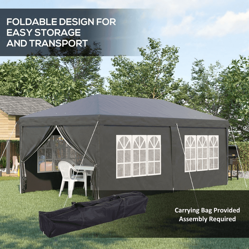 6 x 3 m adjustable steel frame: There are three different heights for you to choose. Powder coated steel forms a strong and spacious structure to host plenty of friends, family and others in the camping gazebo. Accessories included: Party tent with sides comes with carry bag, six guy ropes and 12 ground stakes.