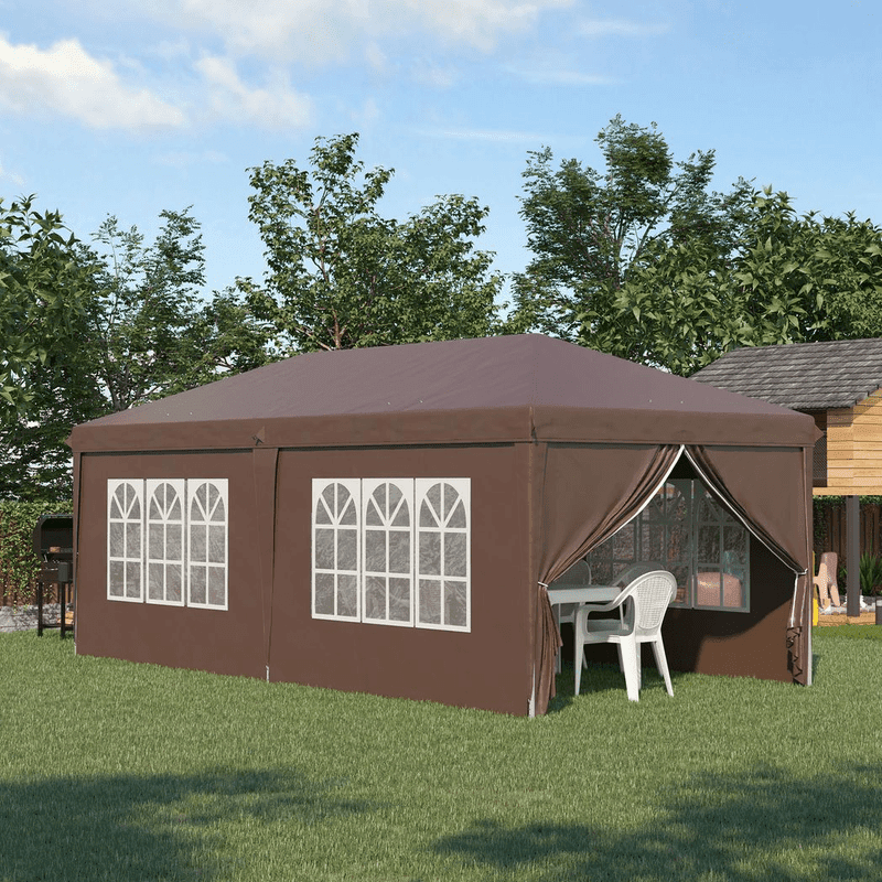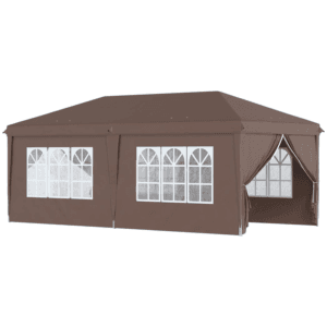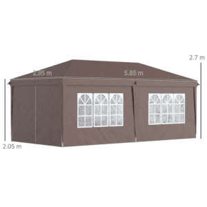 Pop up gazebo: It’s easy to set up whenever you need shelter with the folding design, great for garden parties, BBQs, and other outdoor events. Sidewalls with windows: Hook and loop fasteners wall for easy assembly and removal. 4 sidewalls with large windows of the garden tent for maximum viewing. Front and back wall with zipper for easy access. Protective canopy: Silver-coloured lining helps keep inside heat in, whilst protecting against extreme heat and direct sunlight. There are 12 leak holes for water drainage.6 x 3 m adjustable steel frame: There are three different heights for you to choose. Powder coated steel forms a strong and spacious structure to host plenty of friends, family and others in the camping gazebo. Accessories included: Party tent with sides comes with carry bag, six guy ropes and 12 ground stakes. Dimensions: 5.85L x 2.95Wm, Top Height: 2.7 m, Eave Height: 2.05 m. Quick and easy assembly.