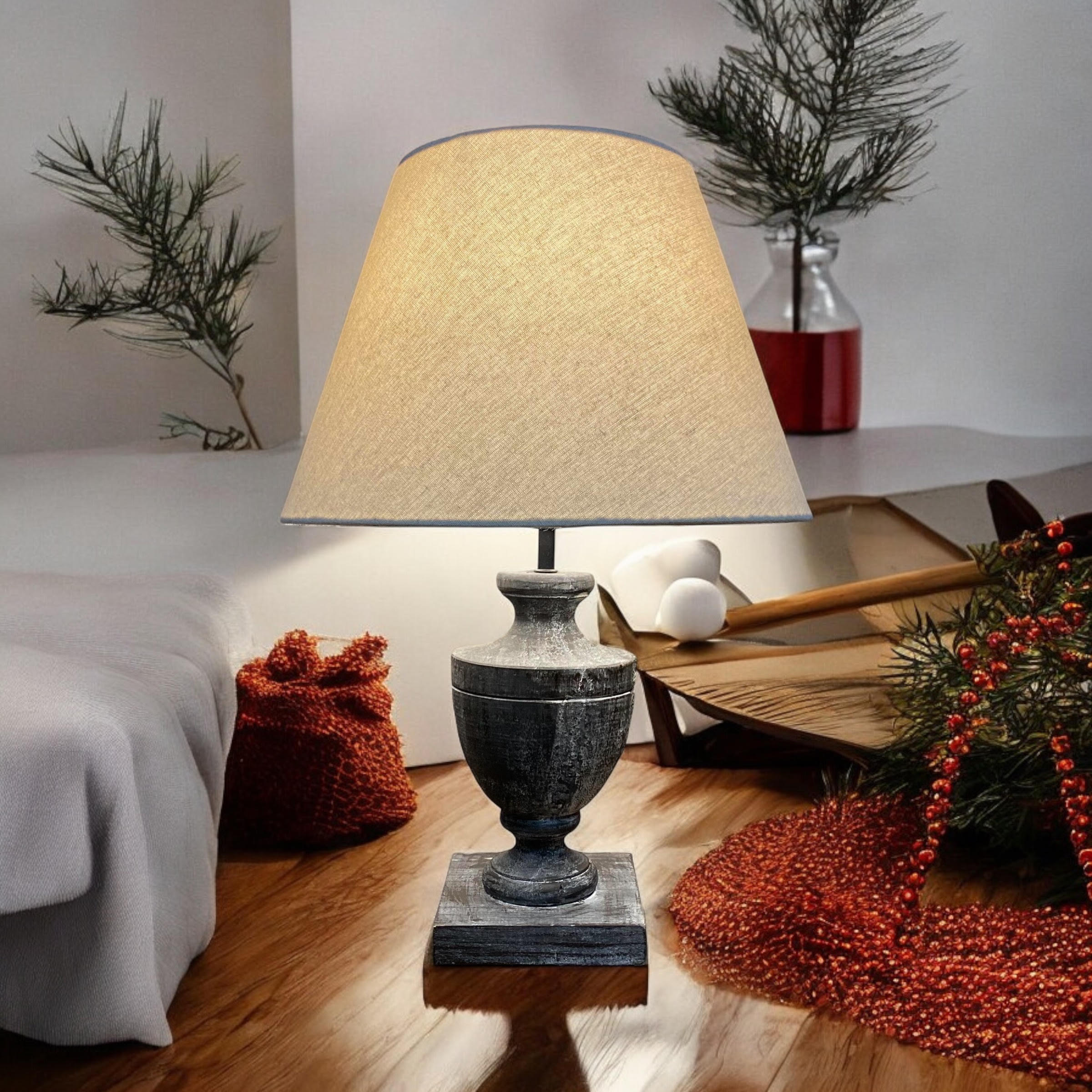 A traditional design table lamp base and shade. The lamp is individually switched by an inline rocker switch and is double insulated to allow for safe use without need of an earth wire. Great for lighting in any setting and ideal in a living room or bedroom.