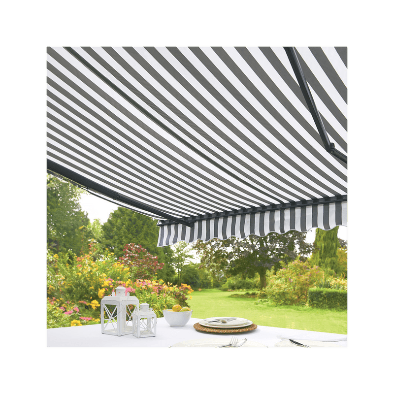 Our popular Greenhurst Deluxe Easy Fit Awnings have high quality 280gm polyester fabric, This is our Kensington awning design which is grey and white stripped. These are ideal to extend the home into the garden by providing simple yet effective cover from sun or showers. Ideal for patio and decking areas. Simple to use, they winch in and out effortlessly. Easy to install with simple to follow instructions. The awning can easily be removed from the brackets for winter storage. This 3m Awning extends out to 2m