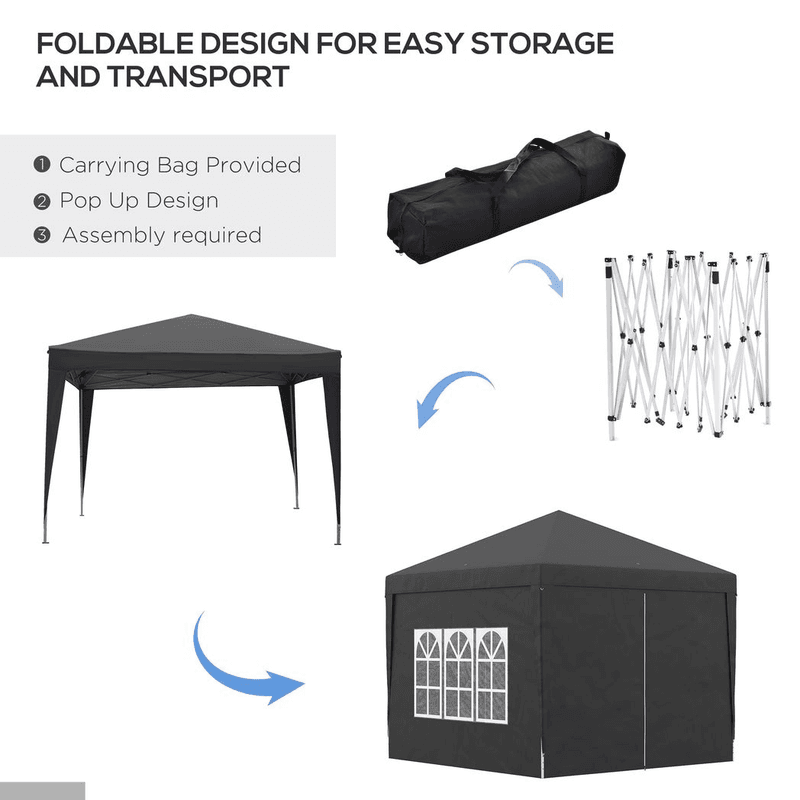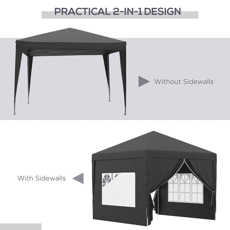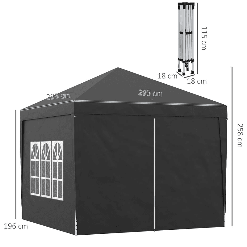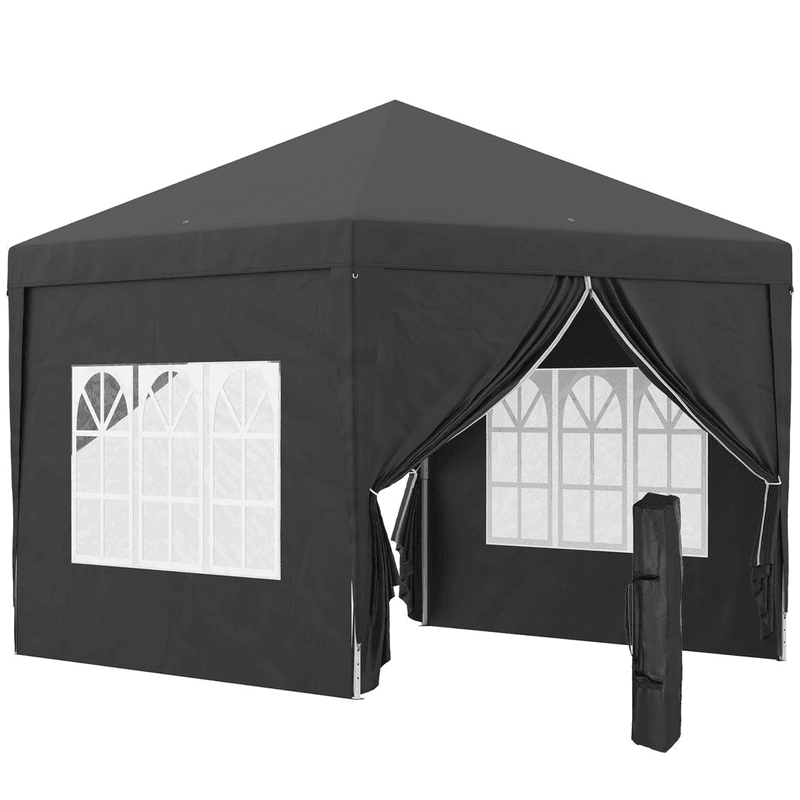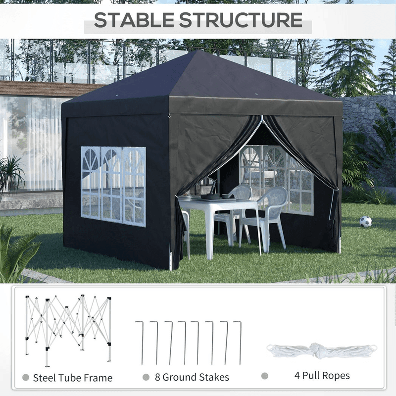 Four removable walls: Pop-up tent can create an open or private feel. Walls come with zipped doors and windows. Steel frame: Powder coated for extra strength, this is a strong core for this garden shelter. 3m x 3m gazebo with sides comes with 4x guy ropes and 8x ground stakes to pin to the ground.