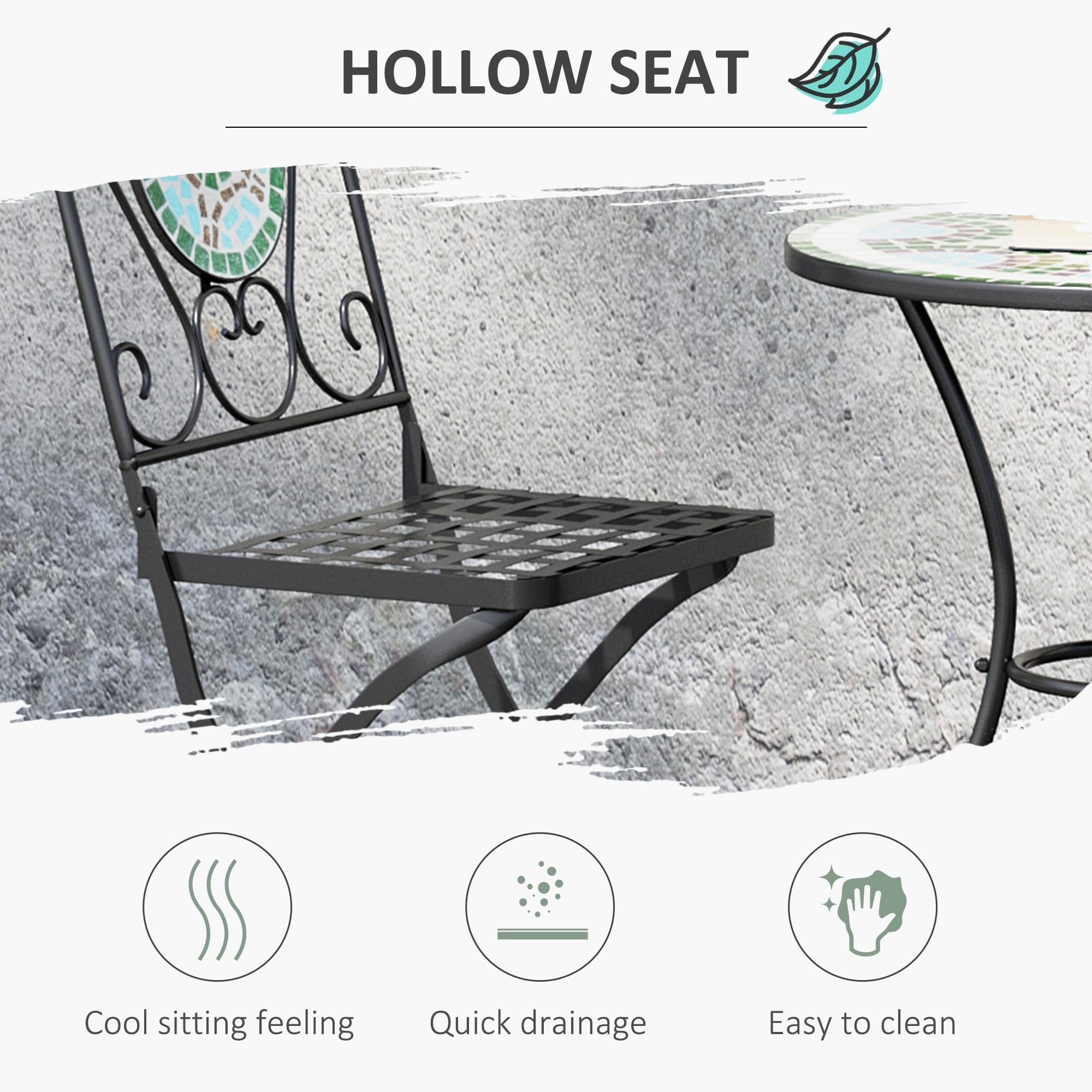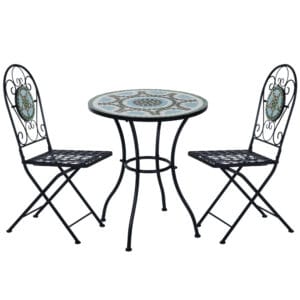 The mosaic bistro set includes 2 chairs and a table, a great addition to any garden Our bistro sets for 2 for garden is the mosaic design on the table and the back of the chairs. The chairs of the garden bistro set for 2 can fold for easy storage when not in use Table Dimension: ?60 x 70H (cm)