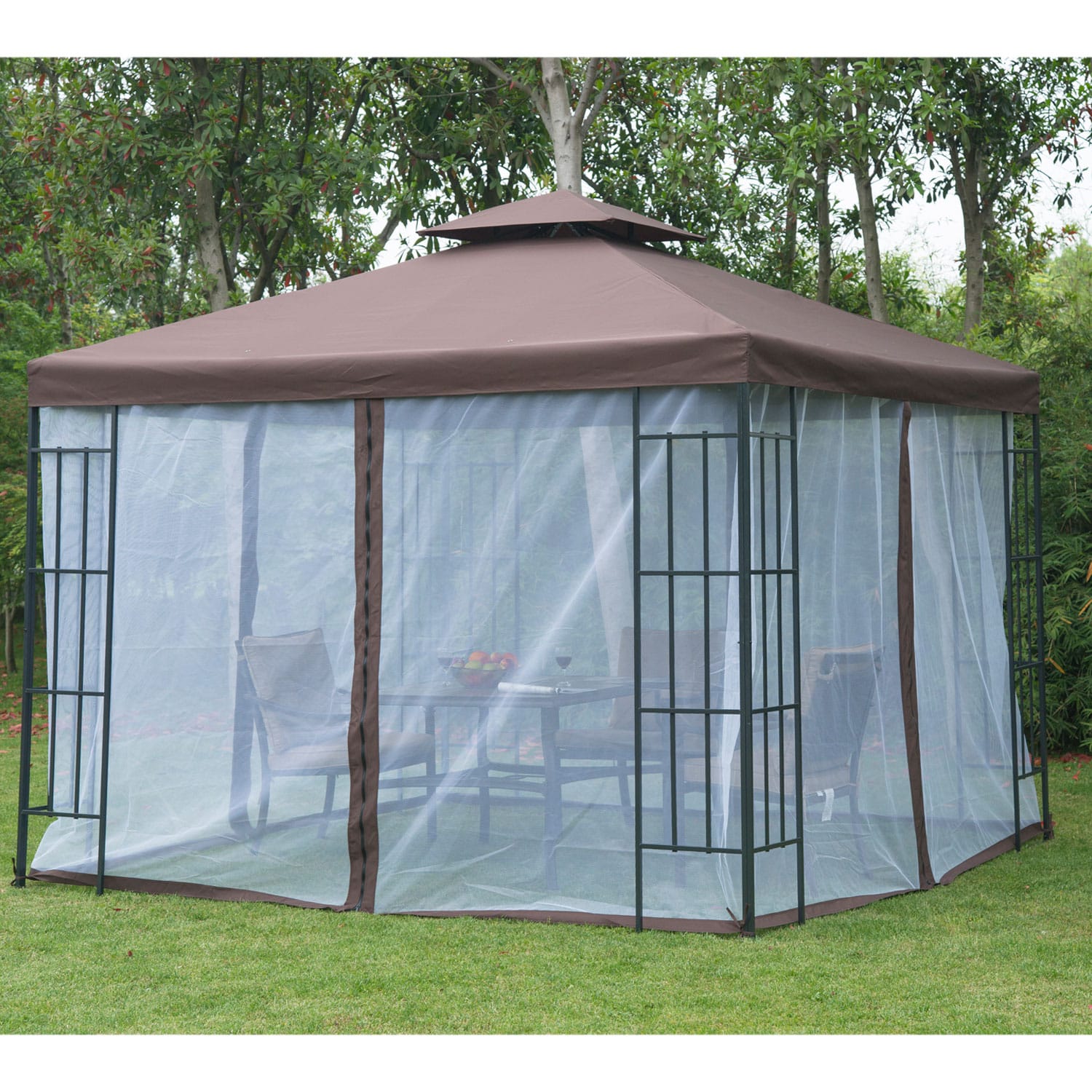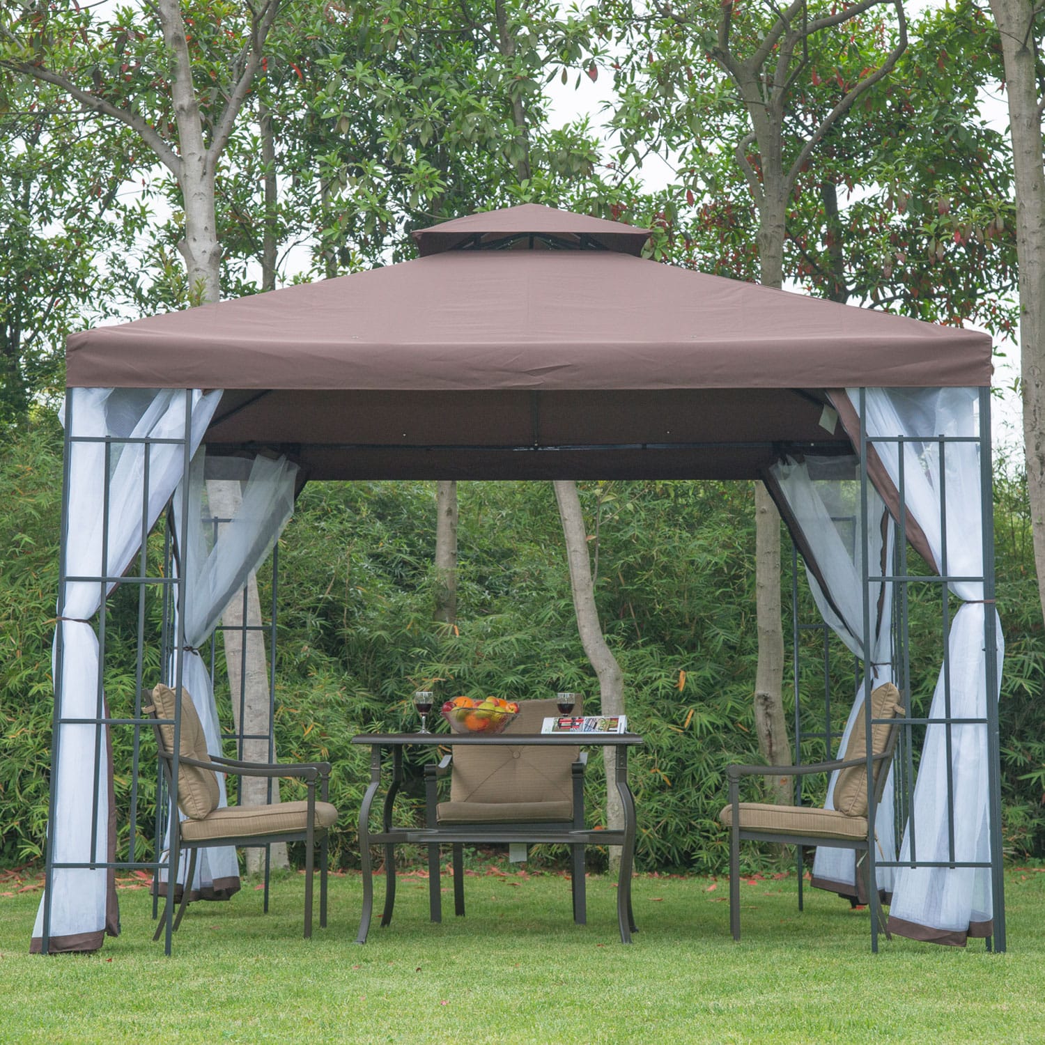 Bring life back to your Gazebo with our 3 X 3m garden gazebo. It will provide your family and your friends comfort and cool. This two tier ventilated canopy has beautiful scalloped edges. It provides protection from the searing sun, pouring rain, and assorted weather elements. The canopy top is perfect for family gatherings, barbecues, afternoon picnics, camping, and birthday parties.