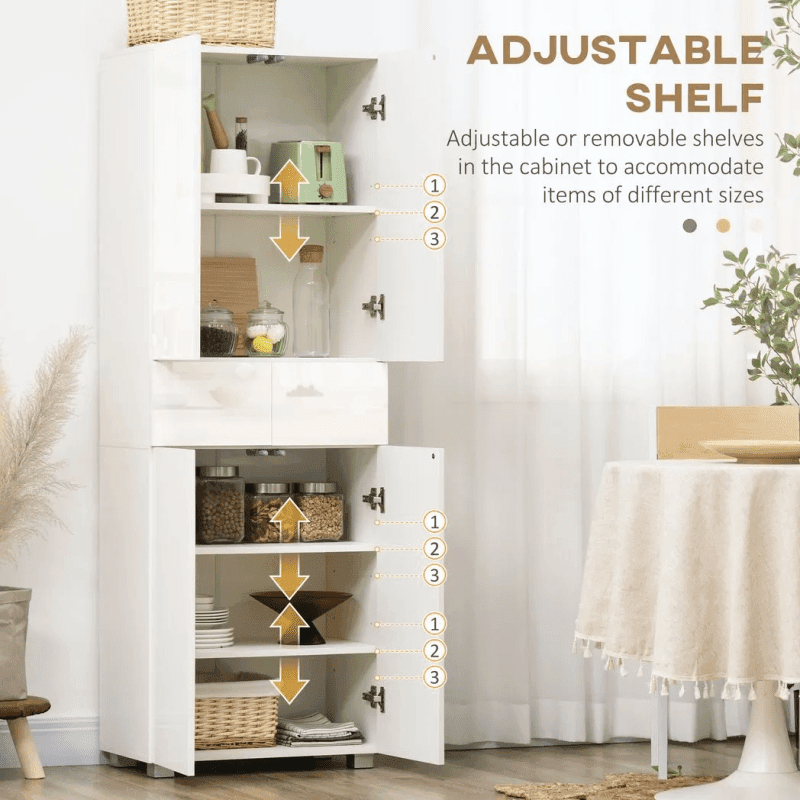 Generous storage, with three flexible shelves: A kitchen larder cupboard with plenty of space to offer – comes with a top cupboard, two middle drawers and bottom cupboard. Move the shelves up/down to create a storage space size you want.