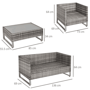 DIMENSIONS: Armchair: 64H x 73W x 69Dcm. Sofa: 64H x 136W x 69Dcm. Table: 34H x 85L x 55.5Wcm. ASSEMBLY REQUIRED.