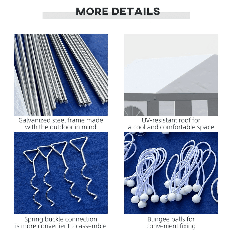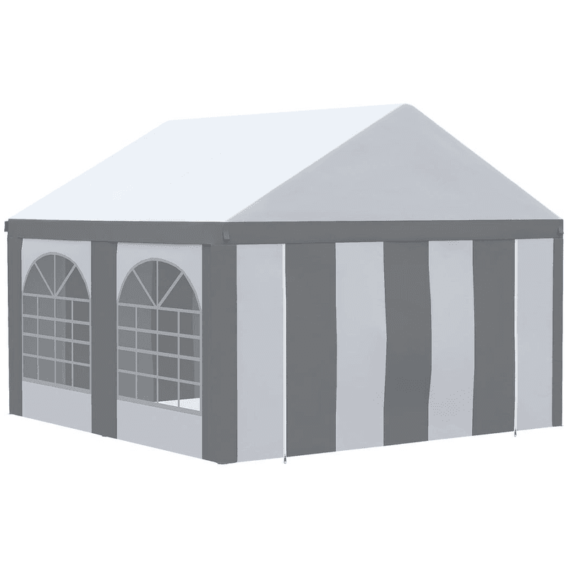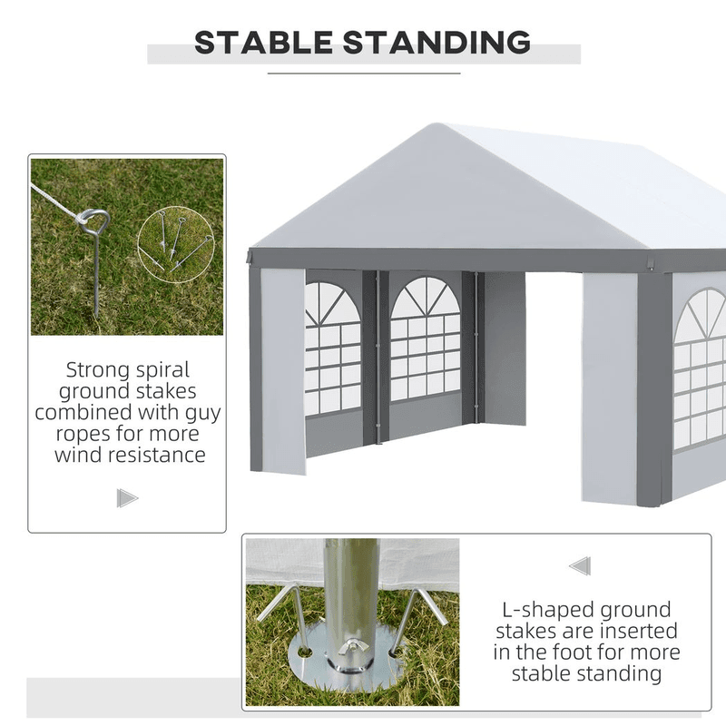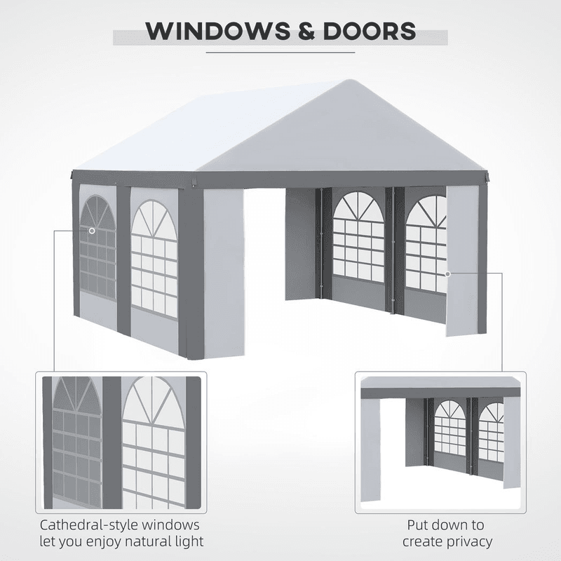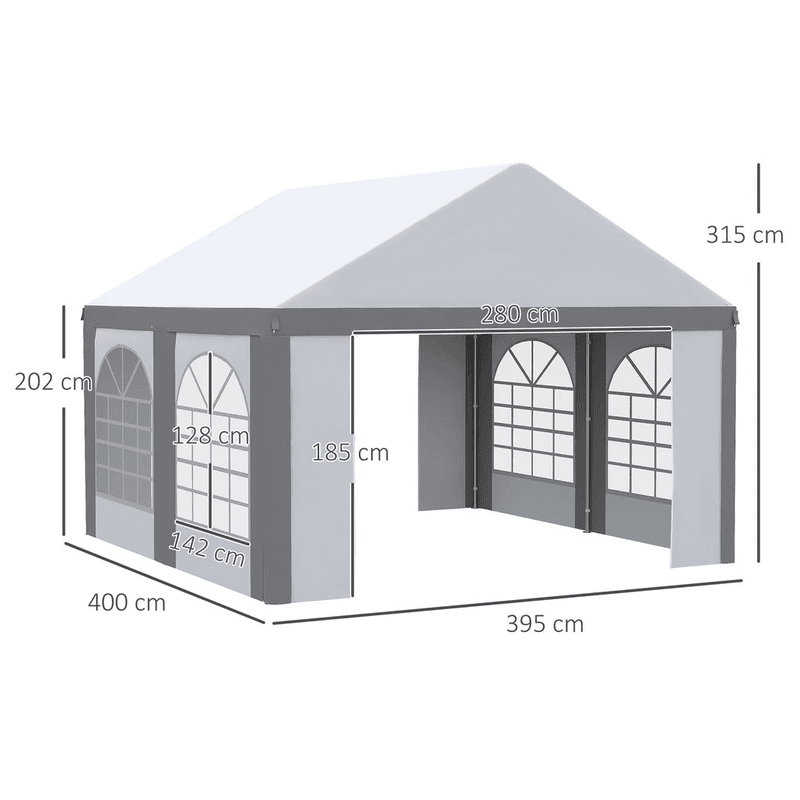 4 x 4m Party Canopy: Party tent holds up to 16 guests – great for gathering your nearest and dearest. Wedding receptions, birthdays, graduation parties, BBQ – and so much more. Four windows and two doors: There’s plenty of light allowance in this garden shelter, so it doesn’t feel too dark when everyone is inside. The walls of this marquee gazebo with sides can be removed – for a more open feel on hotter days. Two zipped doors for easy entry. Protective roof: Top of this garden tent protects you from direct sunlight and light weather when you’re inside this event shelter. Galvanised steel frame: A strong and sturdy structure for this party gazebo. Four guy ropes, four spiral stakes and 12 ground stakes included to pin to the ground. Dimensions: 315H x 400L x 395Wcm. Eaves: 202Hcm. Do not leave gazebo up at night or in heavy rain, wind or snow conditions.