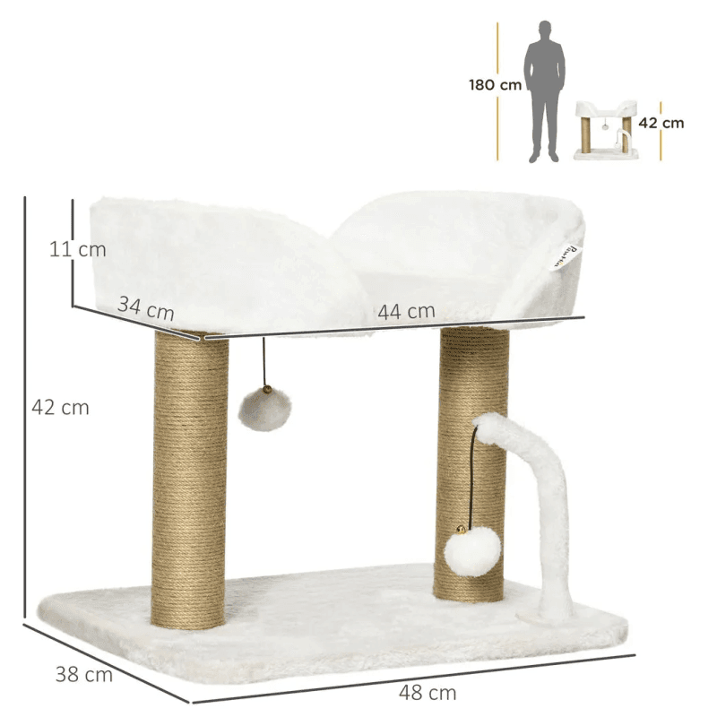 – Cat tower dimensions: 42H x 48L x 38Wcm. Maximum load: 10kg. Suitable for cats under 5kg. Assembly required.