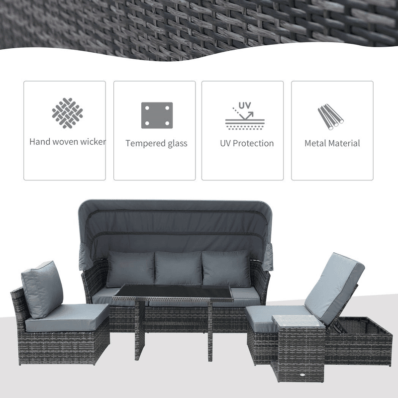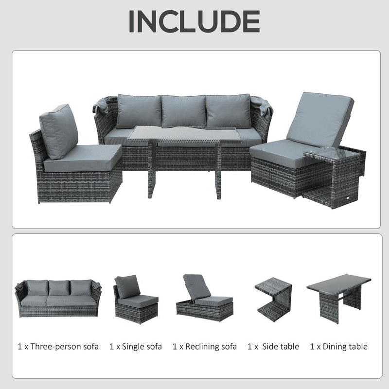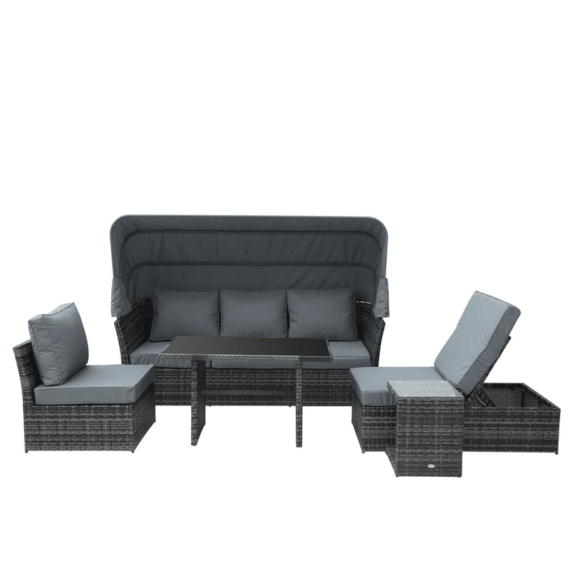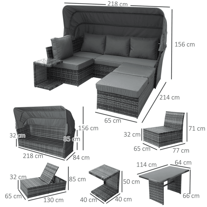 MULTIFUNCTION DESIGN: The rattan garden furniture sets come with a retractable canopy, you can easily open and close the canopy by the gas spring, the side of the sofa can be raised to become a lounge bed, the grey rattan sofa set can be various combinations base on your need.