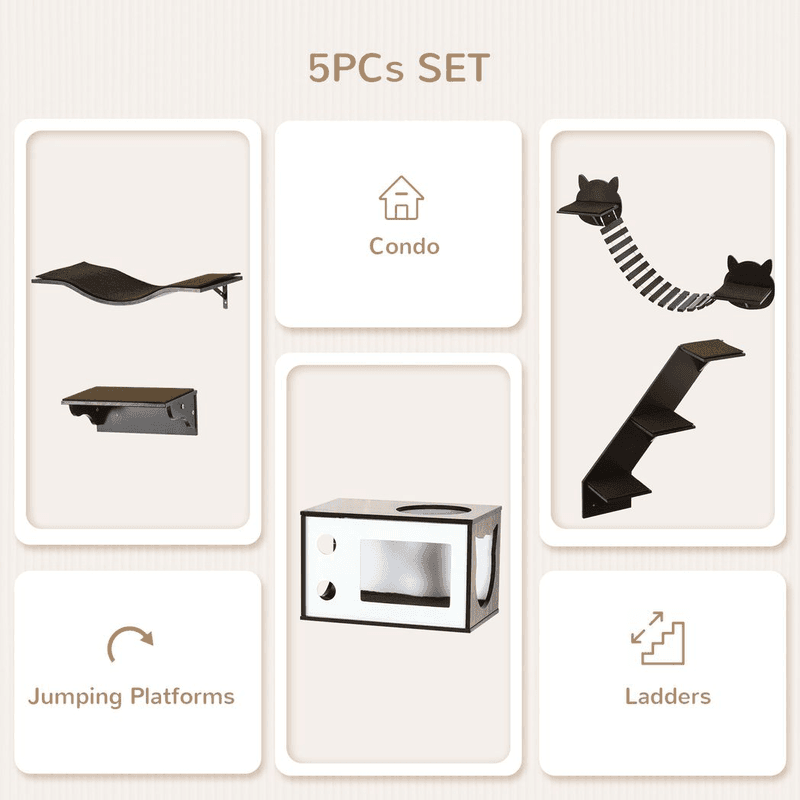 – Curved platform: 12H x 60L x 28Wcm. Stairs: 69H x 66L x 21Wcm. Bridge with platforms: 28H x 134L x 26Wcm. Cat house: 30H x 48L x 30Wcm. Small platform: 14H x 33L x 25Wcm. Recommended cat weight: Under 5kg