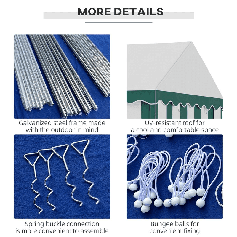 6 x 4m party canopy: Party tent holds up to 16 guests – great for gathering your nearest and dearest. Wedding receptions, birthdays, graduation parties, BBQ – and so much more. Six windows and two doors: There’s plenty of light allowance in this marquee, so it doesn’t feel too dark when everyone is inside. The walls of this marquee gazebo with sides can be removed – for a more open feel on hotter days. Two zipped doors for easy entry. Protective roof: Top of this garden tent protects you from direct sunlight and light weather when you’re inside this event shelter. Galvanised steel frame: A strong and sturdy structure for this party gazebo. Four guy ropes, four spiral stakes and 16 ground stakes included to pin to the ground. Overall dimensions: 310H x 600L x 397W cm. Eaves height: 200H cm. Do not leave gazebo up at night or in heavy rain, wind or snow conditions.
