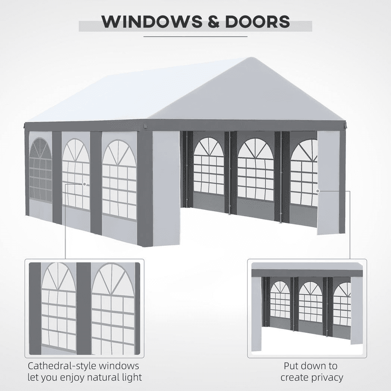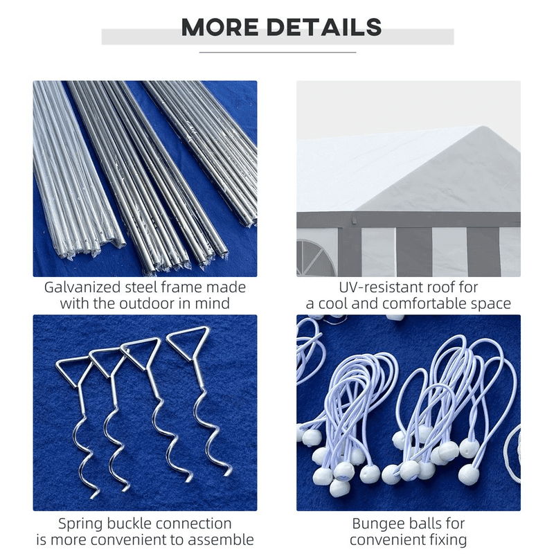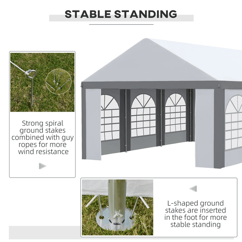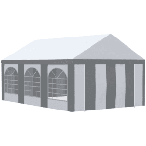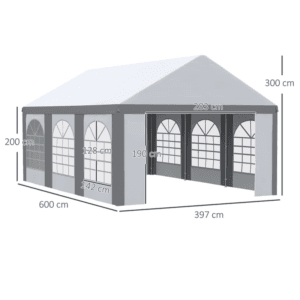 6 x 4m Party Canopy: Party tent holds up to 24 guests – great for gathering your nearest and dearest. Wedding receptions, birthdays, graduation parties, BBQ – and so much more. Six windows and two doors: There’s plenty of light allowance in this garden shelter, so it doesn’t feel too dark when everyone is inside. The walls of this marquee gazebo with sides can be removed – for a more open feel on hotter days. Two zipped doors for easy entry. Protective roof: Top of this garden tent protects you from direct sunlight and light weather when you’re inside this event shelter. Galvanized steel frame: A strong and sturdy structure for this party gazebo. Four guy ropes, four spiral stakes and 16 ground stakes included to pin to the ground. Dimensions: 310H x 600L x 397W cm. Eaves height: 200H cm. Do not leave gazebo up at night or in heavy rain, wind or snow conditions.