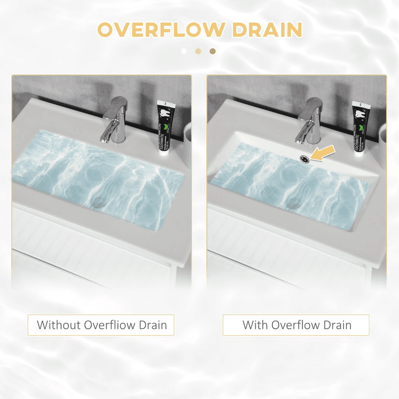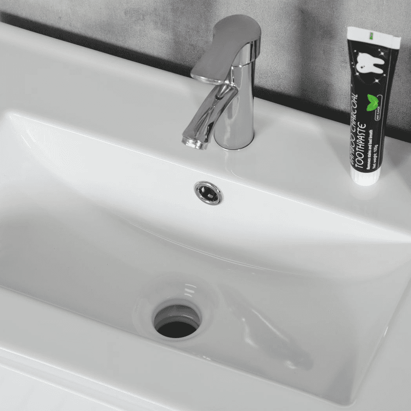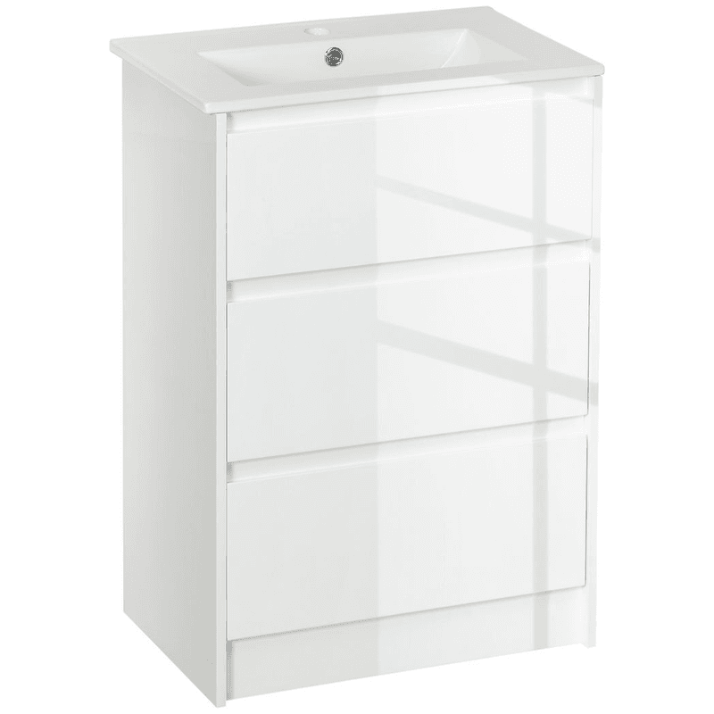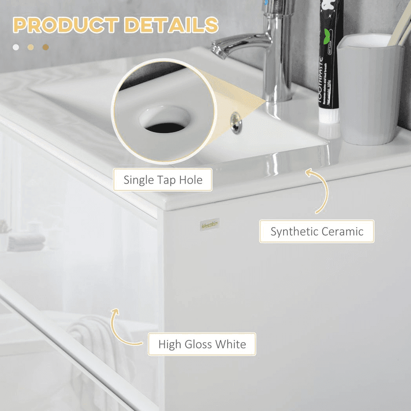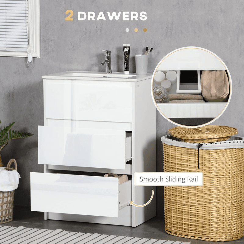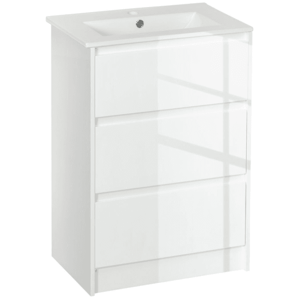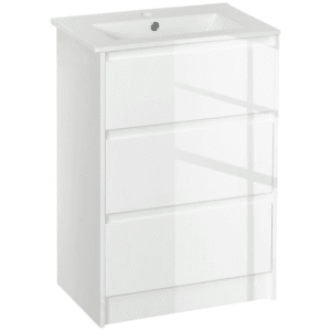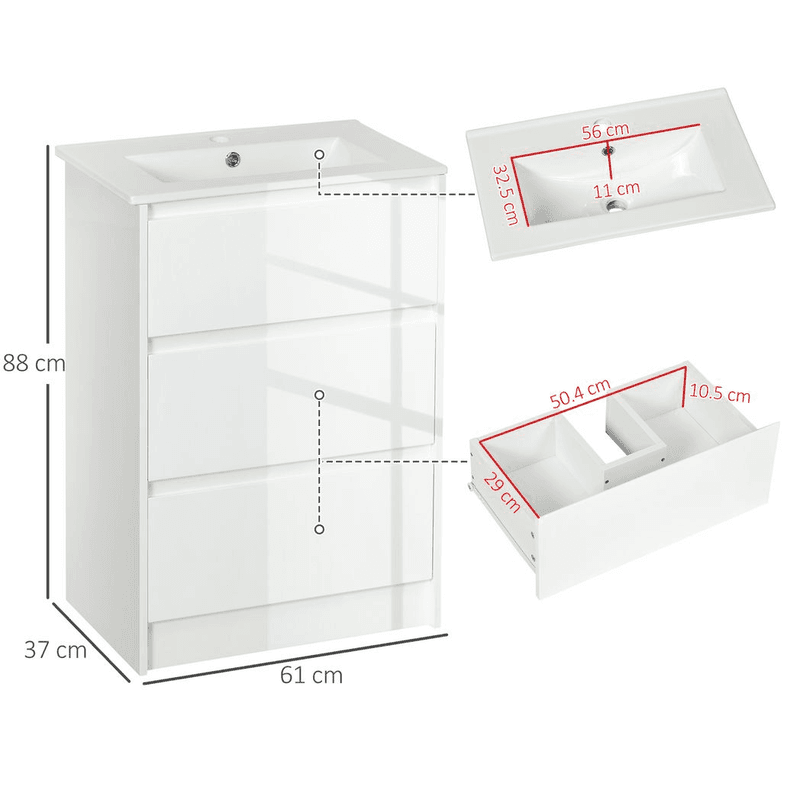Countertop basin: A handy extra on this vanity unit – blends together two bathroom essentials. Great for smaller spaces. Two drawers: Easy to store bathroom essentials in this 600mm vanity unit with basin. Toiletries, towels, cleaning products – whatever you want. Sturdy build, white gloss finish: Made from particle board, this cloakroom vanity unit with basin is sturdy – suitable for everyday use. Gloss is modern and beautiful. Melamine coating: A smooth and lightly protective coating. This small bathroom vanity unit is easy to wipe clean. Dimensions: 88H x 61W x 37Dcm. Basin: 17H x 61W x 37Dcm. Maximum load 46kg. Assembly required.