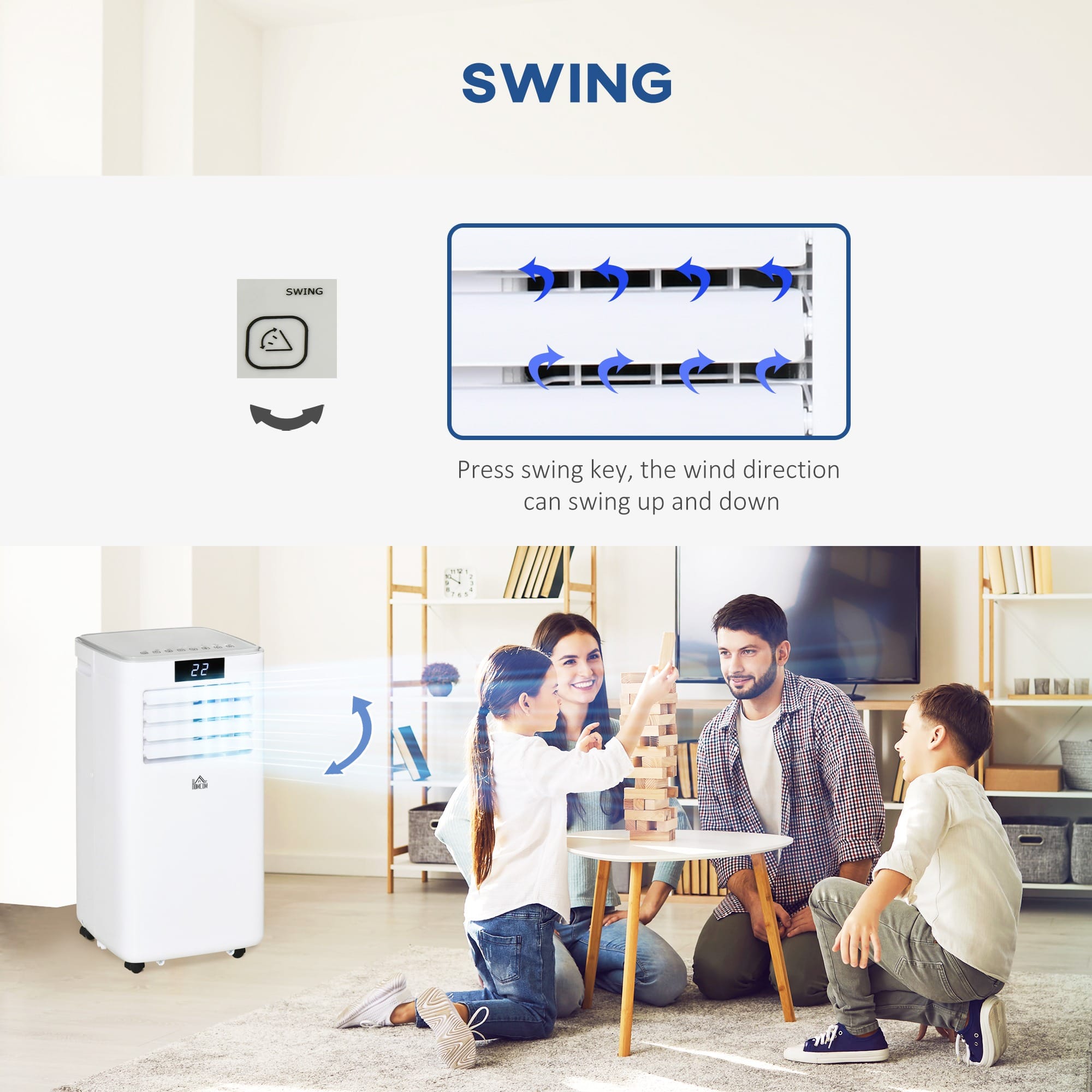 FOUR MODES: Cool/dehumidify/ventilate/sleep – easy to pick a mode you want. Two speeds to go slow or fast. Air blades can be moved up and down. You can use this mobile air conditioner in many environments.
