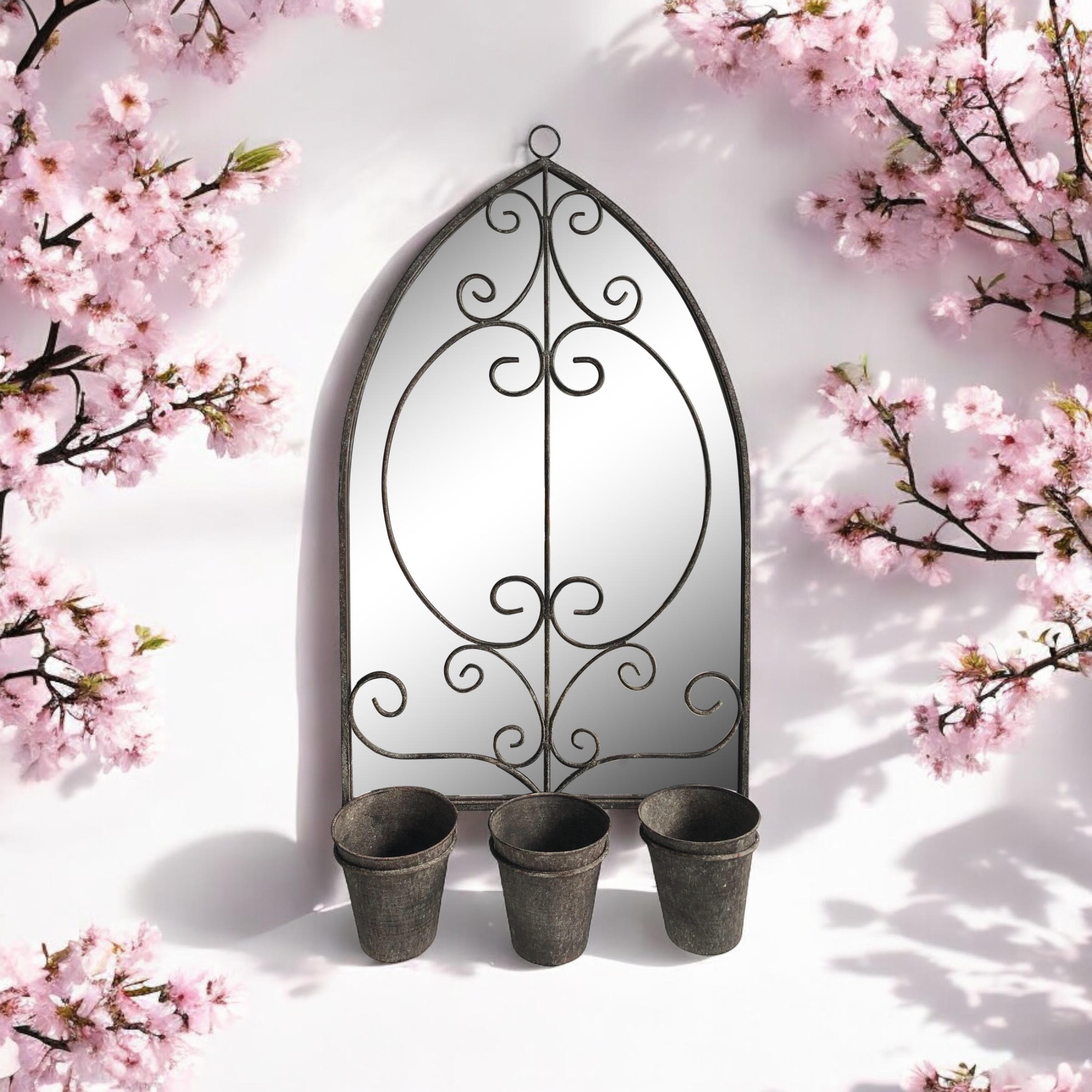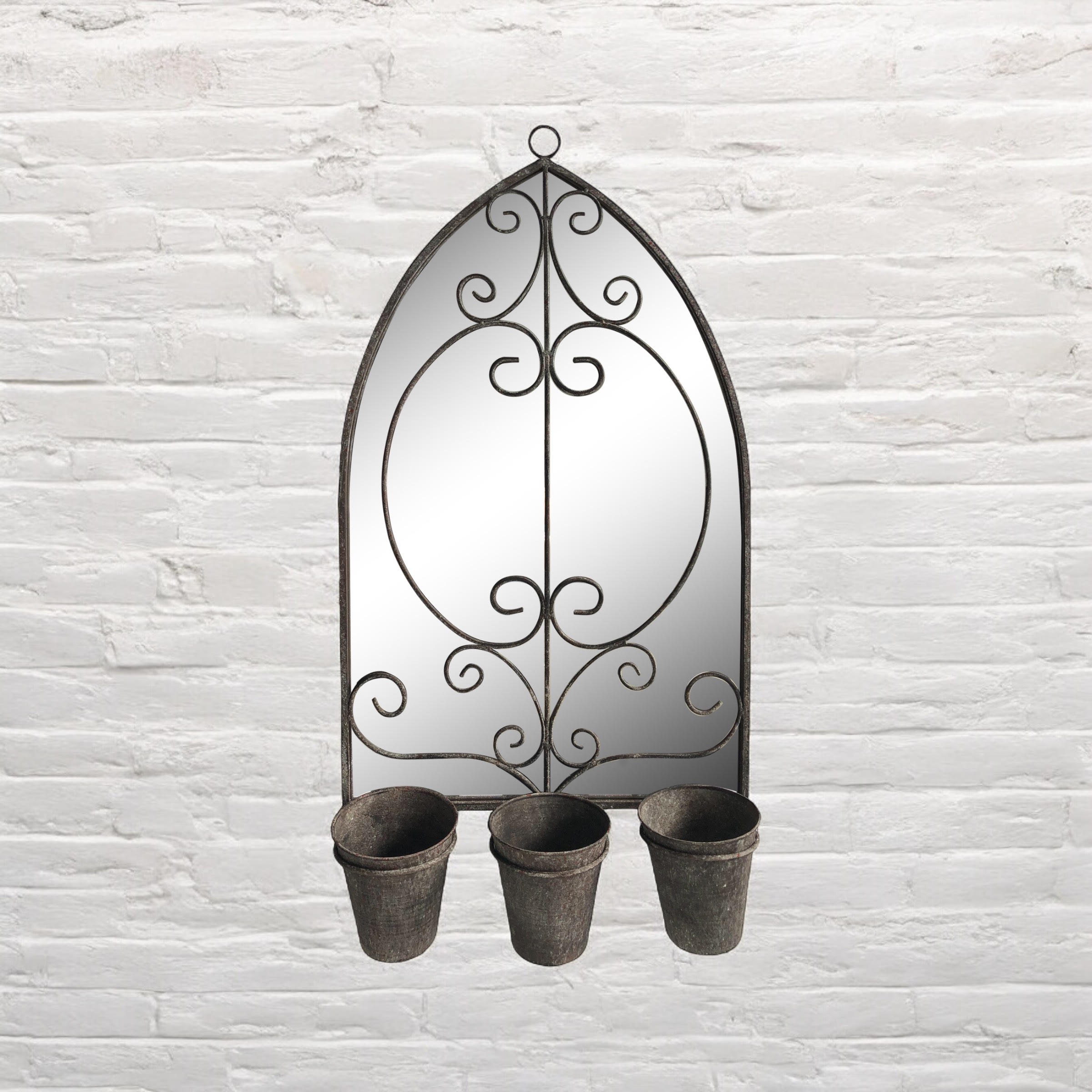 A decorative metal mirror with an antique finish complete with 3 plant holders and pots.