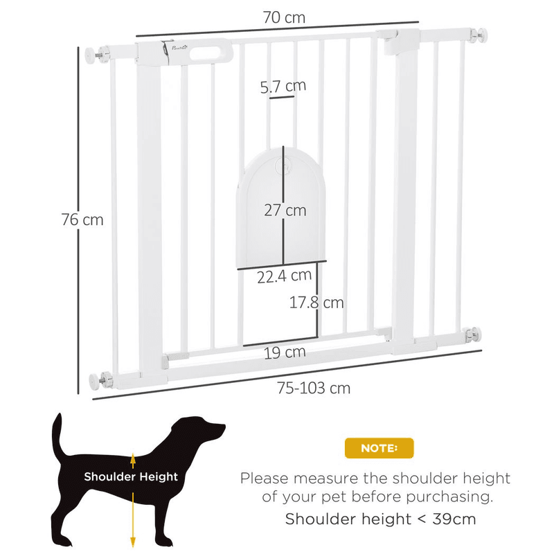 – Pet Gate Information: This gate is ideal for doorways, hallways, stairs, etc. It fits openings ranging from 75 to 103 cm. Please measure your opening before purchasing. Assembly is required.