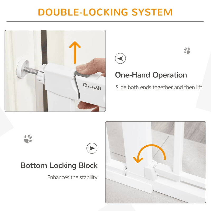 – DOUBLE-LOCKING SYSTEM: The door can be opened with a single hand by sliding the button on the top. To open, slide both ends at the same time and then lift. The gate also comes with a bottom locking block to enhance stability and ensure your pet is secured in place.