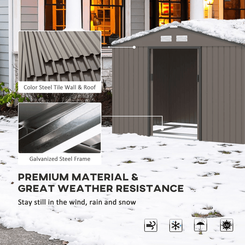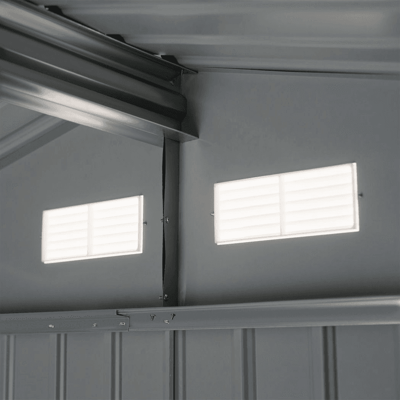 Steel structure: A strong, sturdy metal shed, protecting your equipment inside. Paint coating provides mild weather protection. Ventilation slots to keep inside fresh.