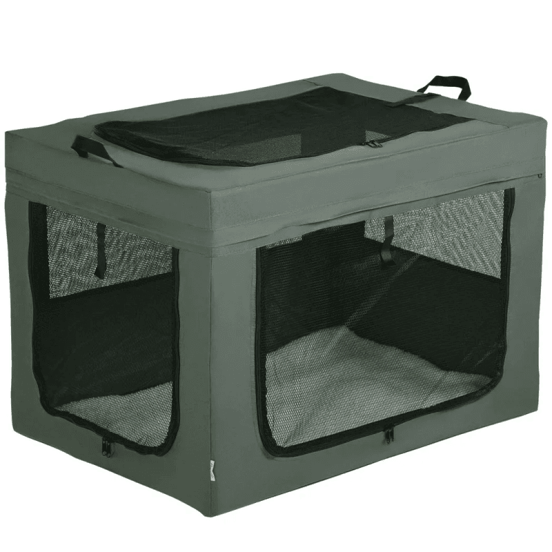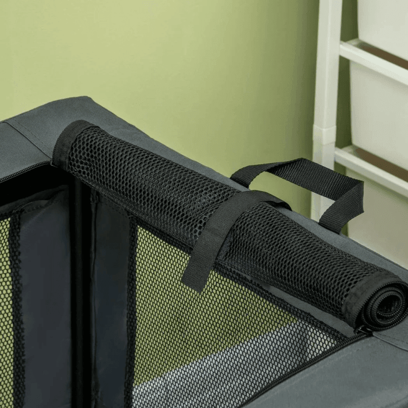 Three doors: One on the top, one on the left side and another at the front. Zip fastening makes it easy for pets to get in and out. Mesh material keeps their space properly ventilated.