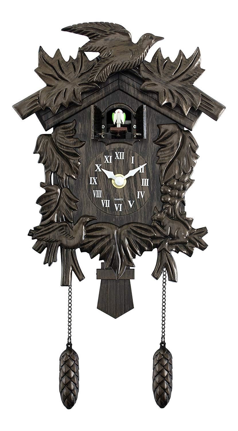Cuckoo Clock with Weights and Pendulum, Hourly Cuckoo Sound ‘Hamburg’ 27828. The Acctim ‘Hamburg’ is a beautiful antique finish traditional styled cuckoo clock. The hourly cuckoo chime has automatic night shut-off so the little cuckoo in the top will snooze all night. The detailed surround is topped with a traditional bird. The ornate Roman Numeral face of the clock adds a nice finishing touch. A stunning focal point in your home. Comes boxed with instructions leaflet.