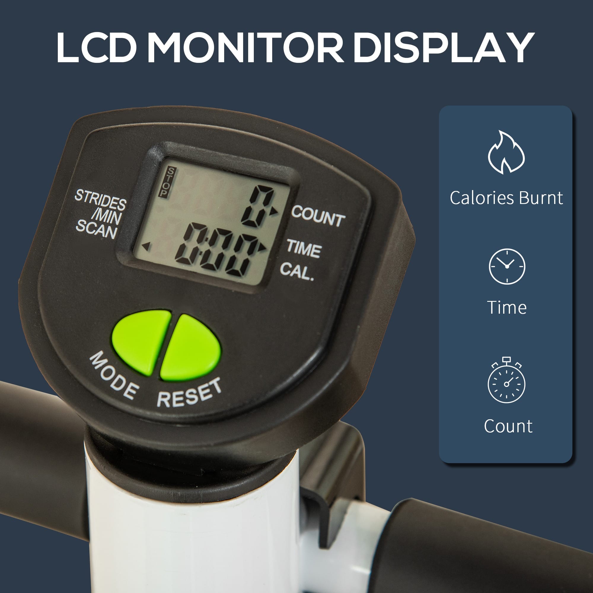 LCD MONITOR: Keeps tracks and displays time, step count, burned calories.