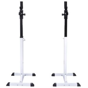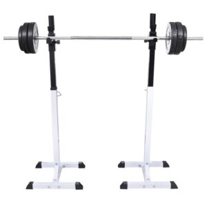This robust and stable barbell/squat rack with a barbell and dumbbell set is perfect for your home gym! In combination with a workout bench, it will be suitable for bench press training as well as squats. This stable barbell rack is suitable for barbell bars with a diameter of approximately 45-50 mm. It has a rugged steel construction and a maximum load capacity of 80 kg. The rack is adjustable in height and suitable for almost any body size and various exercises. Moreover, it is compact and space saving. The barbell and dumbbell set features solid chrome-plated bars with quick-action spring collars (for barbell bar), non-slip knurled grips, and fluted star-screw caps (for dumbbell bars) for secure attachment of the weight plates. You can work out without worrying about safety issues. The weight plates are made with a robust polyethylene casing. They can be combined in various ways for different training purposes. Delivery includes a barbell/squat rack, a barbell bar, two dumbbell bars, six 1.25 kg weight plates, four 2.5 kg weight plates, two 5 kg weight plates, four caps and two spring collars.