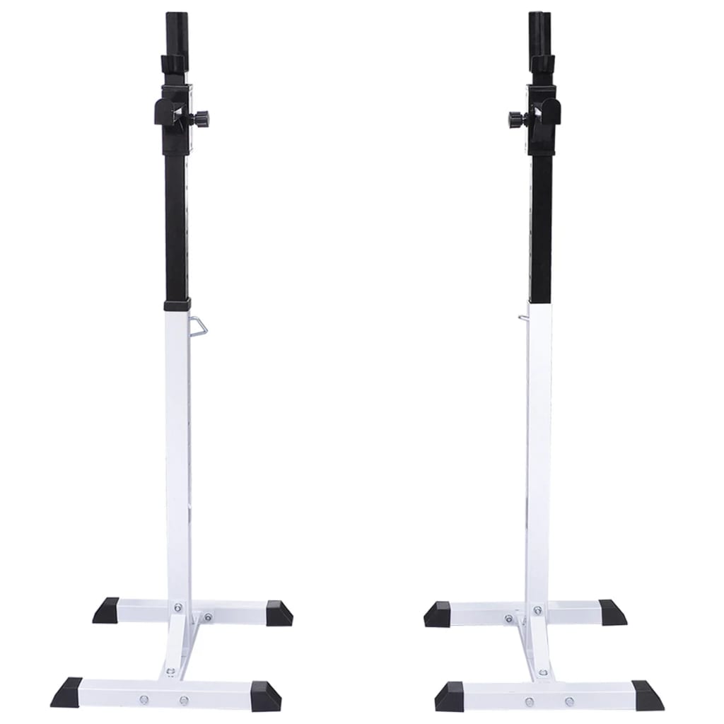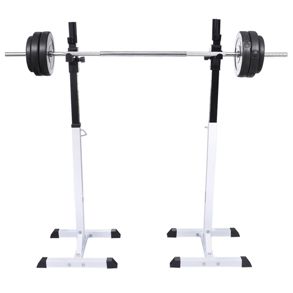 This robust and stable barbell/squat rack with a barbell and dumbbell set is perfect for your home gym! In combination with a workout bench, it will be suitable for bench press training as well as squats. This stable barbell rack is suitable for barbell bars with a diameter of approximately 45-50 mm. It has a rugged steel construction and a maximum load capacity of 80 kg. The rack is adjustable in height and suitable for almost any body size and various exercises. Moreover, it is compact and space saving. The barbell and dumbbell set features solid chrome-plated bars with quick-action spring collars (for barbell bar), non-slip knurled grips, and fluted star-screw caps (for dumbbell bars) for secure attachment of the weight plates. You can work out without worrying about safety issues. The weight plates are made with a robust polyethylene casing. They can be combined in various ways for different training purposes. Delivery includes a barbell/squat rack, a barbell bar, two dumbbell bars, six 1.25 kg weight plates, four 2.5 kg weight plates, four 5 kg weight plates, two 10 kg weight plates, four caps and two spring collars.