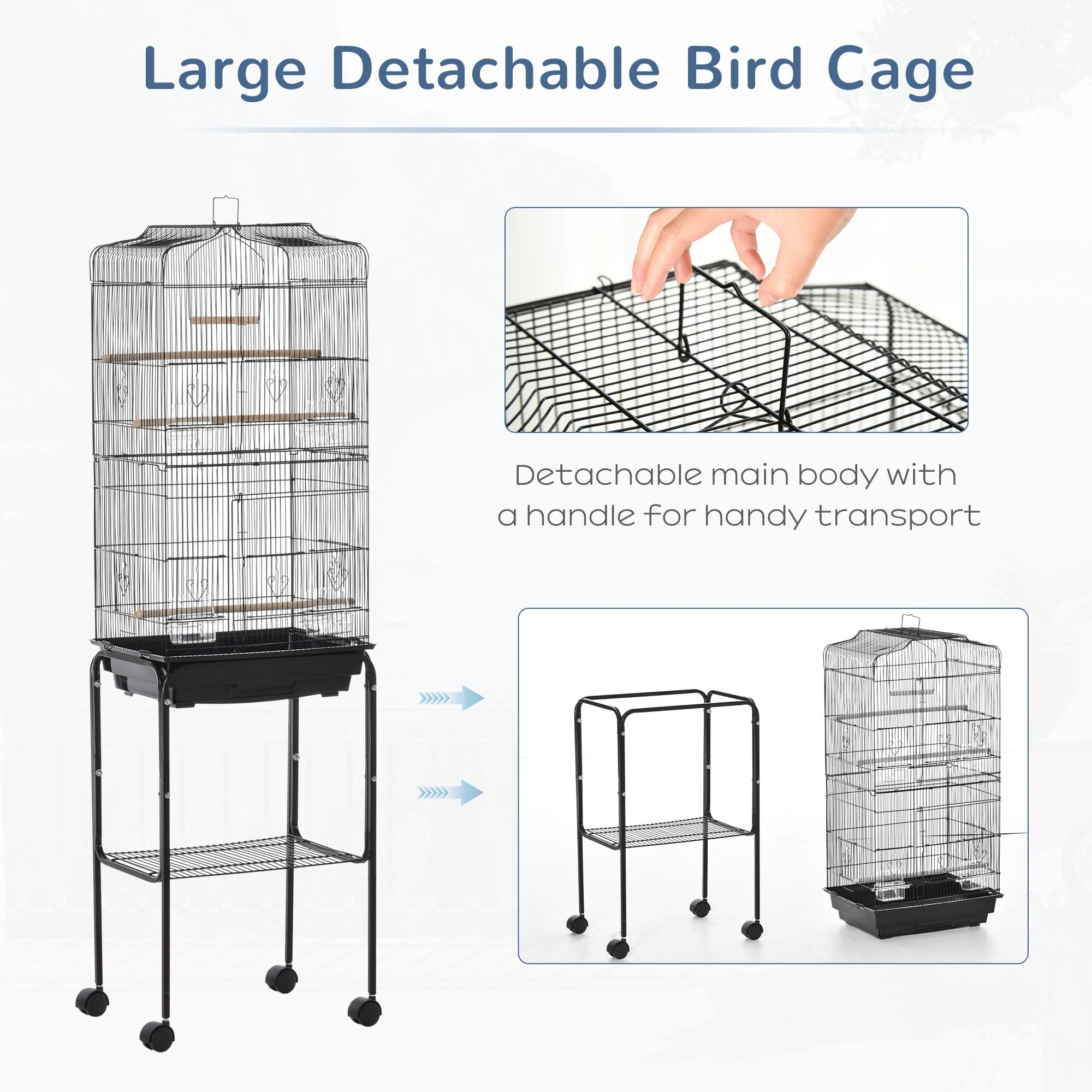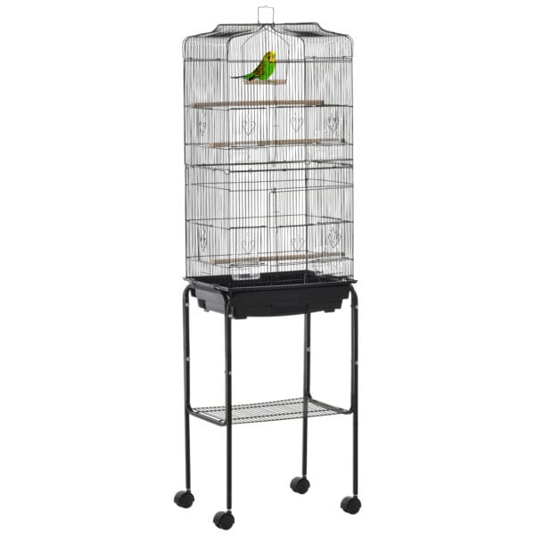 Spacious design made from powder-coated metal for security – Inside features three perches, one swing and four food trays – Two large front doors for easy access – Removable four wheeled tray to move cage around easily with handle on top of cage to lift – Slide-out cleaning tray – Bottom storage basket for supplies and more – Assembly required – Suitable for finches, small parrots and other small birds