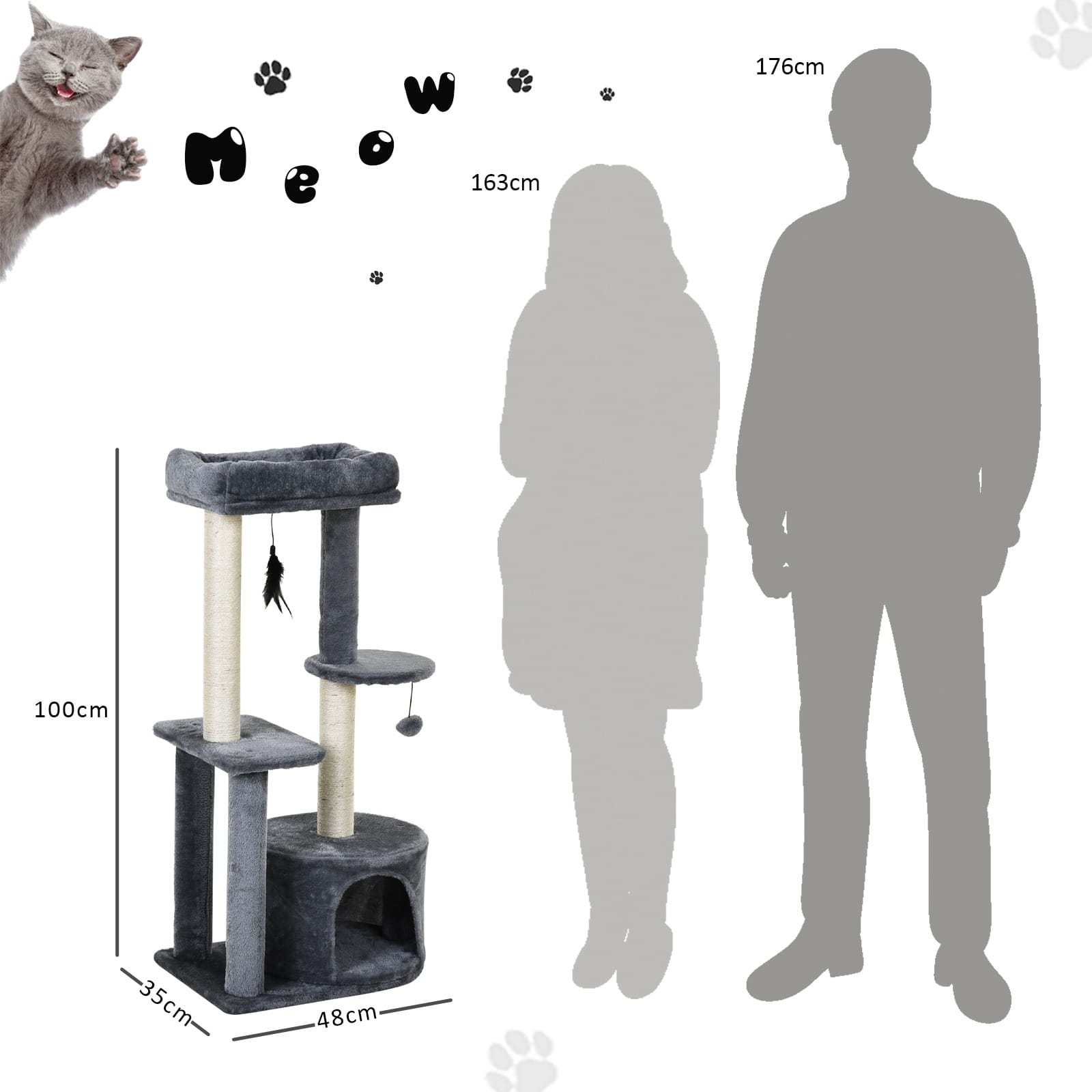 Perfect cat play tower: Features one cat house, two platforms, a top perch, a play ball and a little feather to keep them entertained and active day and night. Solid frame: Made from particle board, this cat tree tower is a sturdy structure which keeps upright when your cat is climbing and resting. Sisal scratching posts: Natural composition is safe against your cat’s claws. Also deters them away from using your furniture. Plush covering: Completely soft to the touch, making the cat climbing tower comfortable and safe for your pet. Max weight: 4.5kg.Dimensions: Whole: 100H x 48L x 35Wcm. Bottom hut: 24H x 35Dcm. Round platform: ?25cm. Square platform: 32L x 21Wcm. Top perch:35L x 25W x 7Hcm. EASY TO ASSEMBLE.