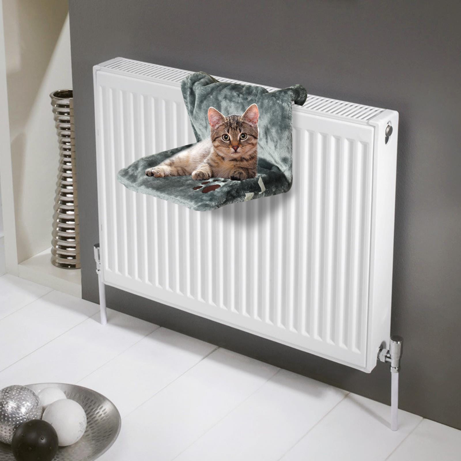 Cat Radiator Bed – Super Soft Faux Fur Size – 42cm x 31cm x 24cm Approx. Ideal for all cats and kittens. Easily hooks over most radiators. Strong durable frame. Folds down for easy storage. Keeps your pet warm and cosy Removable and washable cover. Package Includes: 1x Cat Radiator Bed