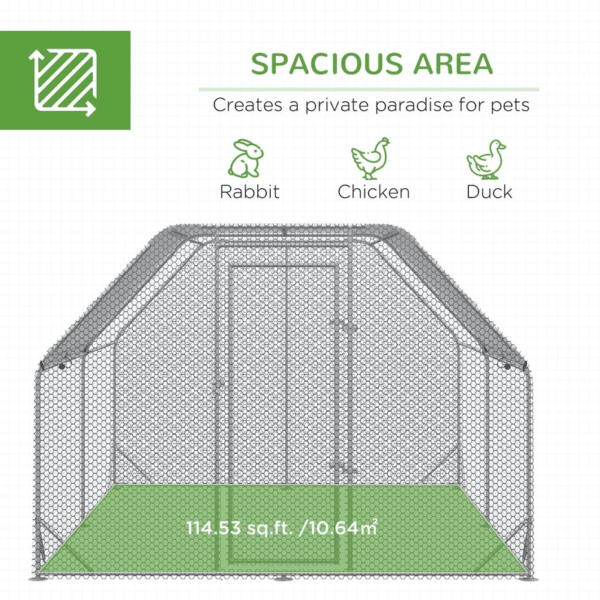 Tall entrance: Owners can walk in and out of this duck coop, so they can feed and interact with pets easily. The door comes with a lock to keep pets securely inside the walk in chicken run when needed.