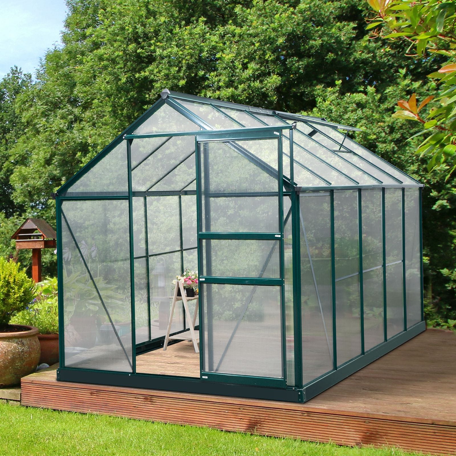 This Outsunny Polycarbonate Walk-In Garden Greenhouse is perfect for the home gardening enthusiast who is looking for a way to stay in the soil all year-round. It offers all the protection your plants need to thrive without having to spend a great deal of green yourself. The powder-coated aluminium frame and UV-resistant, polycarbonate sheets will keep your plants, vegetables, and more safe. These transparent sheets allow natural lighting to pass throughout the entire structure. A rooftop vent ensures excellent ventilation for your unit. A convenient single sliding door design provides easy access to the inside. Easy to assemble and take down, our Outsunny polycarbonate aluminium greenhouse is the ideal solution for keeping your plants happy and healthy throughout the year.