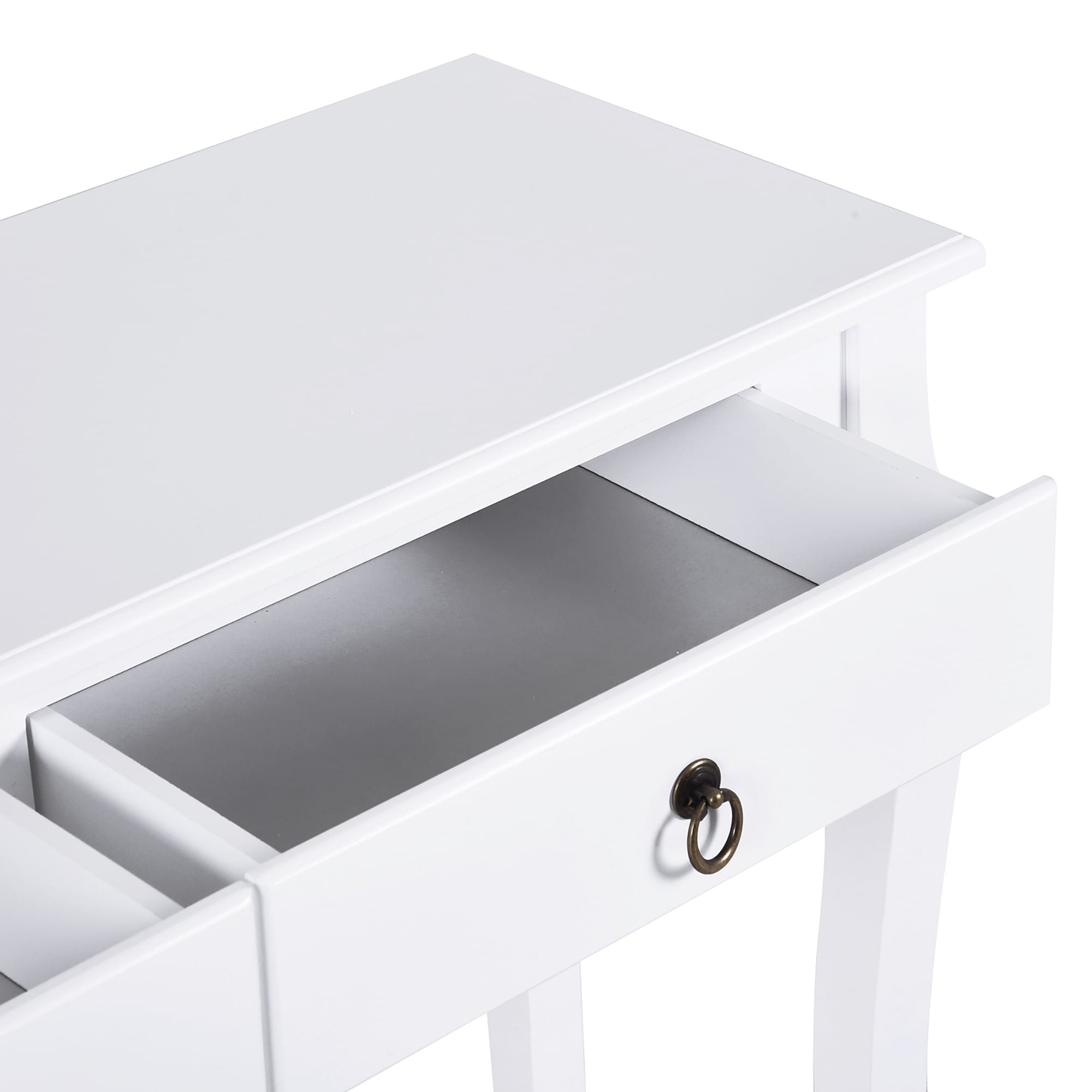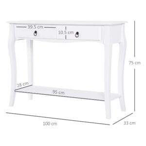 Wide table top, 2 drawers and 1 lower shelf offer spacious storage and display
