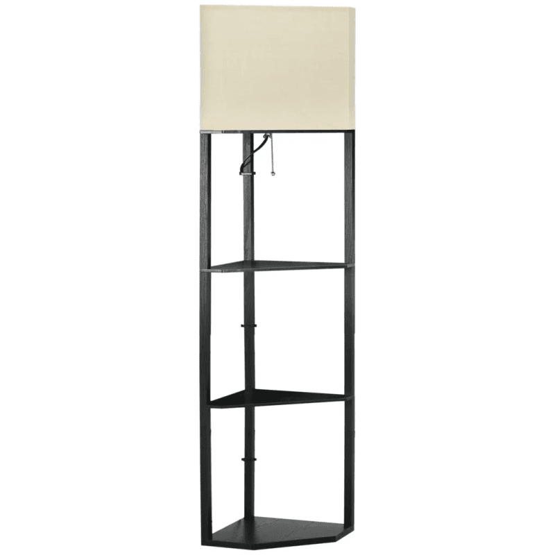 Triangle shape: A perfect corner lamp – slot into a place where you want. Bringing storage and light into unutilised places. Floor lamp with shelves: Three levels to storage and display your favourite pieces. A standing lamp to hold books, decorations, plants and photos – whatever you want. Top light: Fitted on the top of this tall lamp, illuminates the area gently thanks its fabric shade. Operated by pull chain. E27 base, maximum 40W bulb. Sturdy: Made from MDF, the structure of this living room lamp is supportive and suitable for everyday use. Dimensions: 159H x 50L x 37Wcm. Shelf: 39H x 43L x 26.5Wcm. Maximum load 2.5kg per shelf. Easy to assemble.