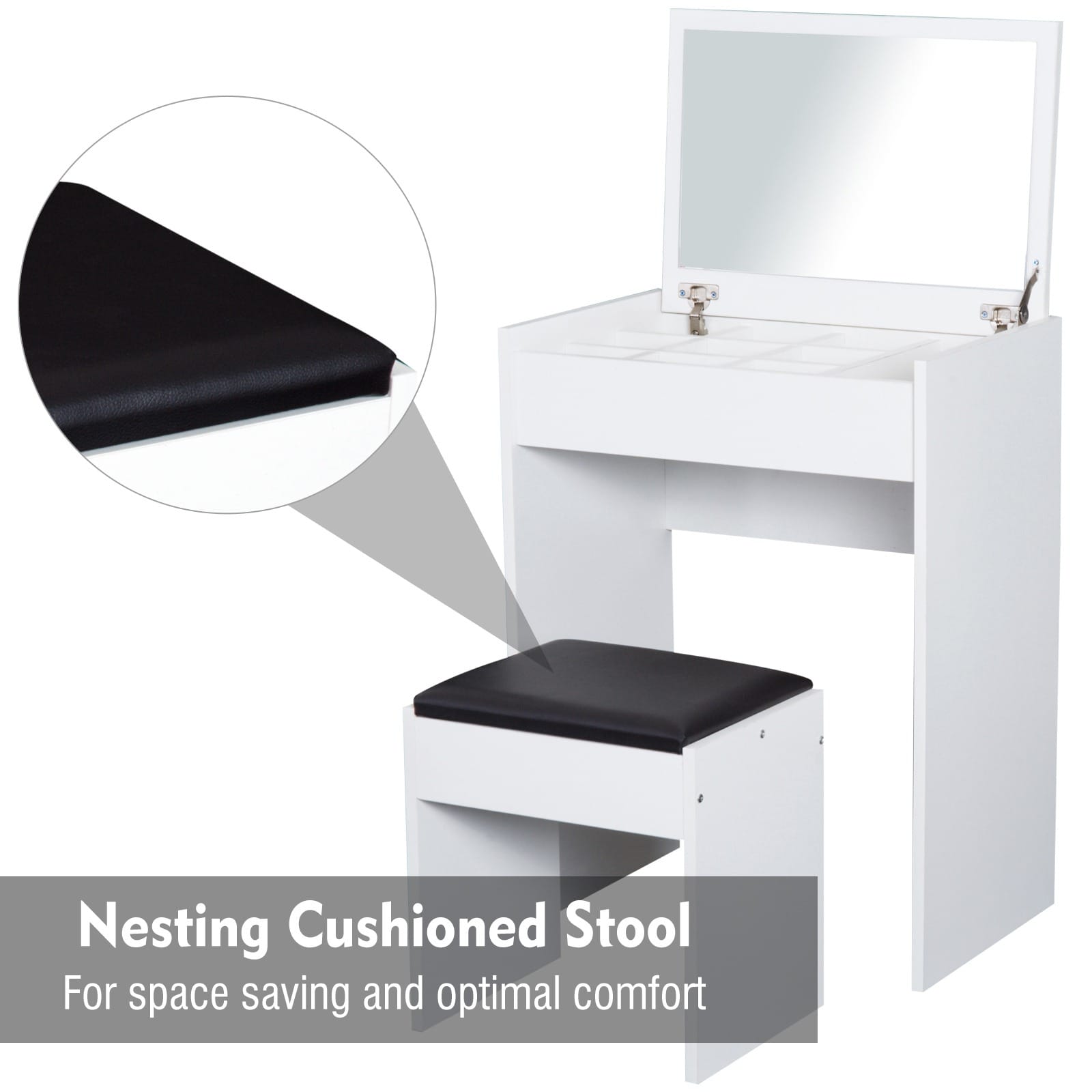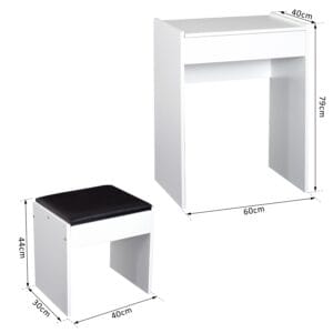 Flip-up mirror on the lid for convenient making up. Hidden space with removable divider under the lid for ample storage. Easy to convert from a chic dressing table to a writing desk. Padded stool with smooth leather and soft sponge for added comfort. Table: 60.2L x 40.2W x 79H cm. Stool: 40L x 30W x 44H cm. Assembly required.