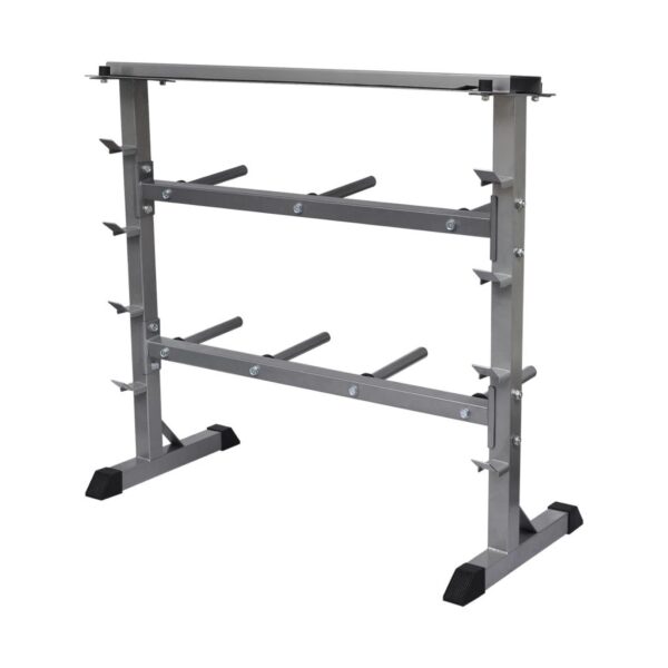 This dumbbell barbell rack is designed to keep free weights, dumbbells and barbells organized and off the floor. It accommodates most dumbbell sizes and styles, including neoprene and cast iron. The stable frame and two shelves will help you maintain a cleaner home gym environment by providing a spot to park your dumbbells when they are not in use. It is made of heavy duty steel for years of use. The rubber non-slip base helps to protect floors from damage and ensures the stability and optimum safety. This rack with its rugged construction has a max load of 300 kg. It’s also suitable for almost all lengths of barbell . It measures 49 by 100 by 95 cm when fully assembled.