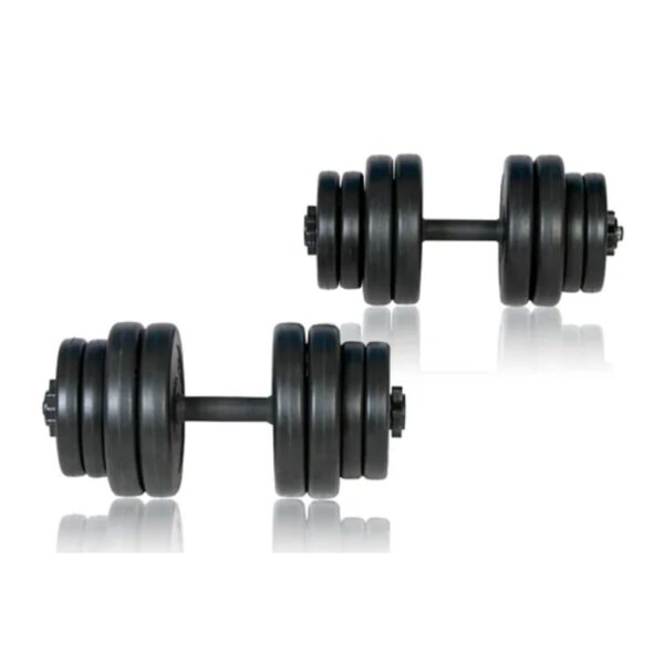 This ergonomic dumbbell set has a total weight of 30 kg (2 x 15 kg). The dumbbells have anti-slip plastic handles so you will be able to work-out without having to worry that the dumbbells will slip from your hands and fall. The screw-caps have star bolts to make sure that the weight plates are always mounted firmly and secure on the bar. The bar of the dumbbell is made of strong metal. The grip surface is approx. 14.5 cm. The weight plates are covered with robust, floor-friendly plastic, which allows you not to experience any annoying clanging sounds of the weights.