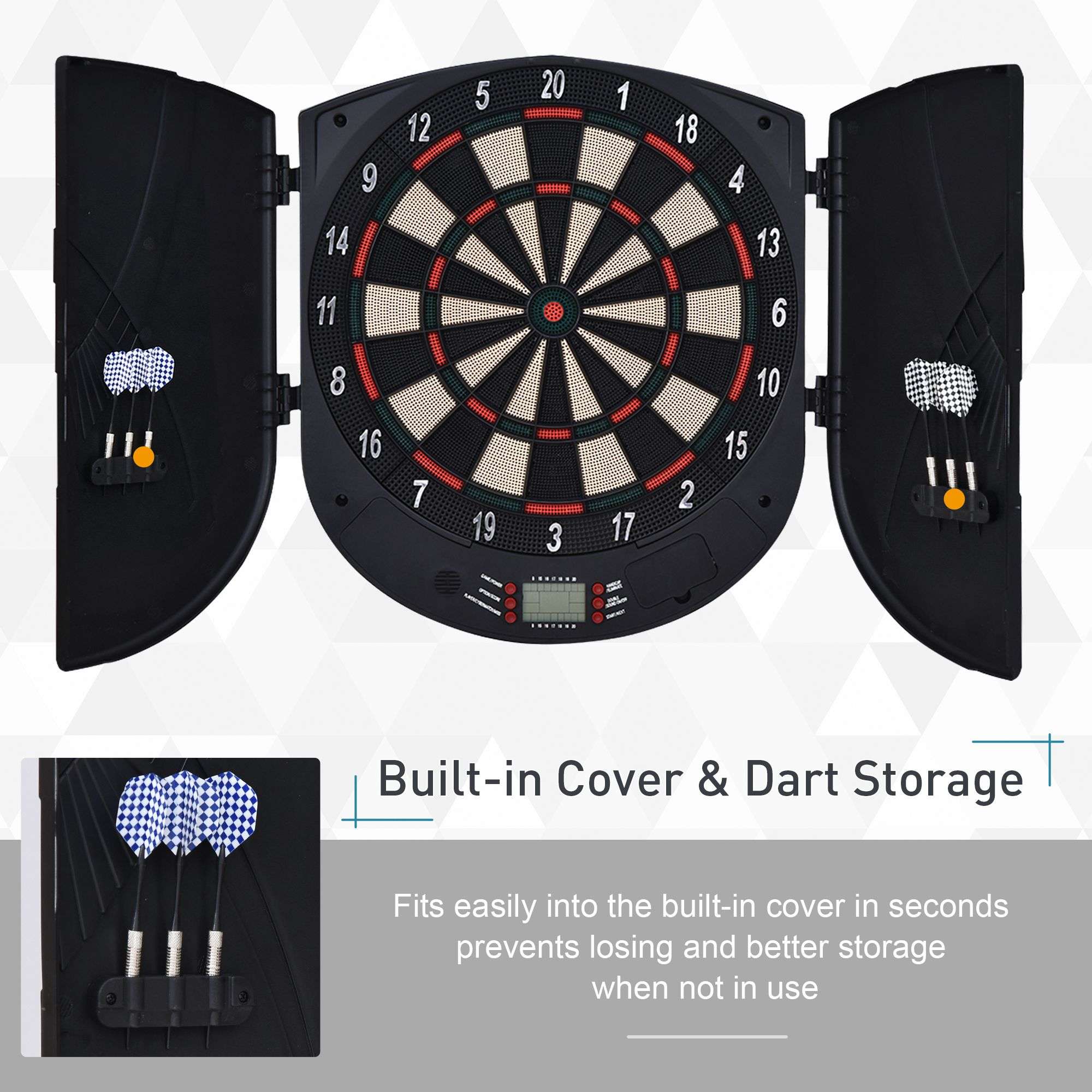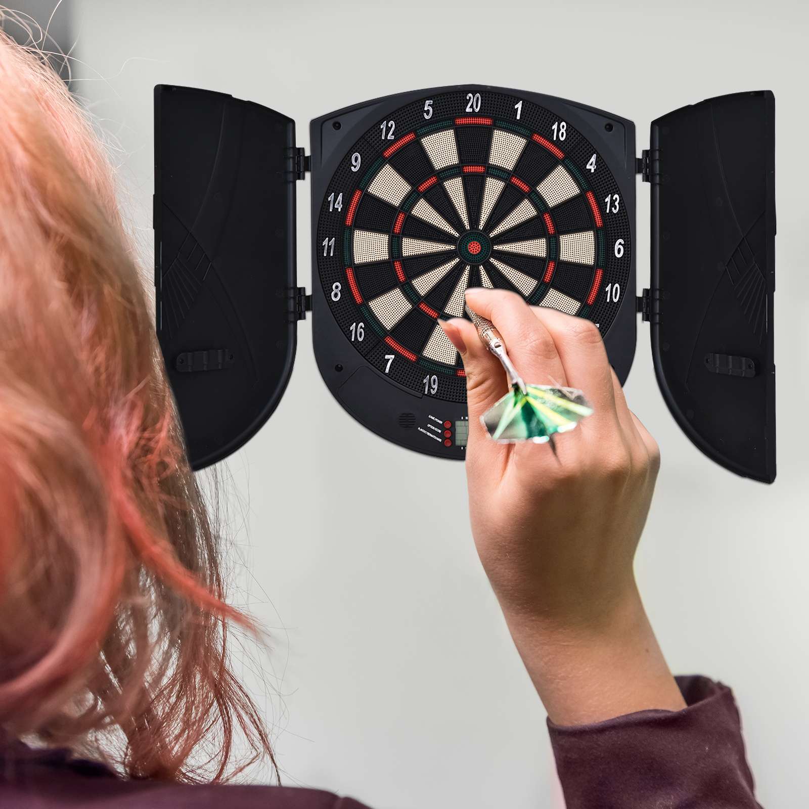 MULTI-GAME MODES: 26 games and 185 scoring options allow maximum 8 players to play at the same time, 6 darts include perfect play at home, office, and bar, and more. SCORING BOARD: Easy to read control panel with LCD display scoring and statistics. Language tips with volume control with returning darts and eliminating points, automatic scoring (it can play against computer players). HIGH-QUALITY MATERIALS: The Electronic dartboard is made from durable PS&PP boards allow you to enjoy the game. EXTRA PROTECTION: The two side doors can be open during play the game increases the surround area to protecting your walls from any missed shots and also can storage the darts. DIMENSIONS: 44 cm x 4.4 cm x 50 cm, 6 piece darts include
